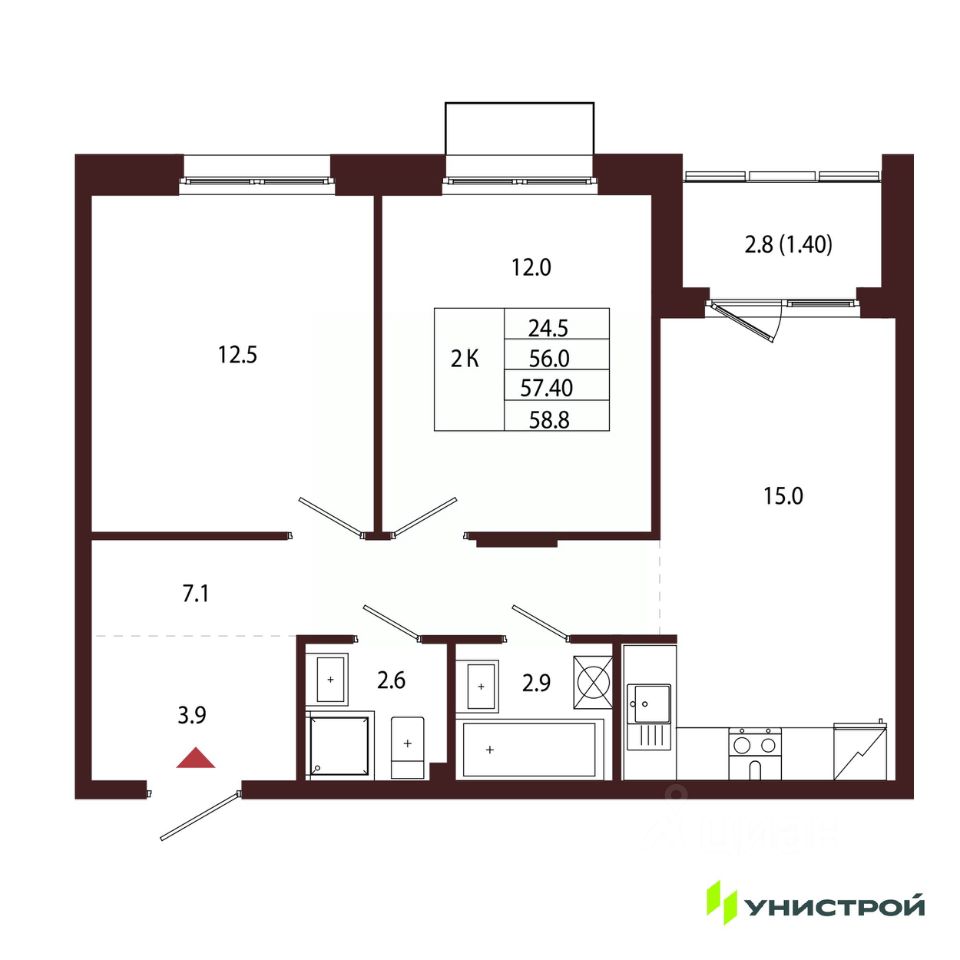 Общая площадь57,4 м2
