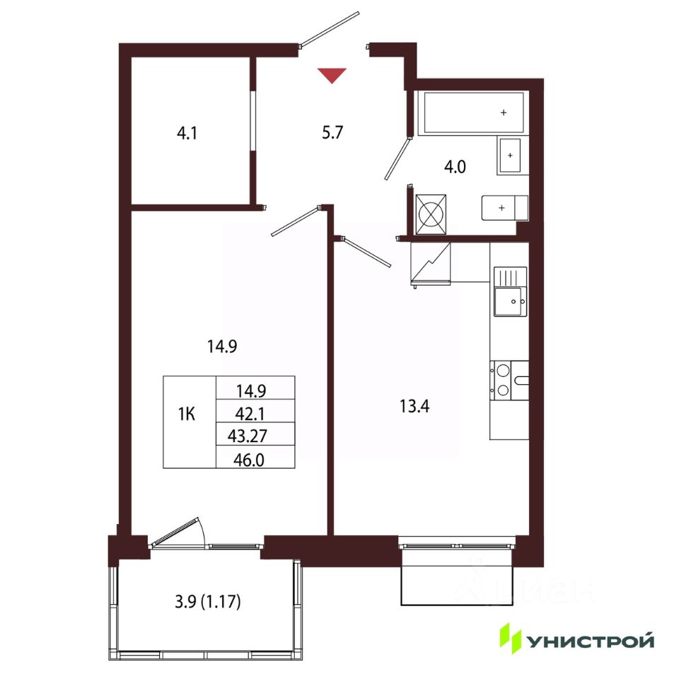 Общая площадь43,27 м2