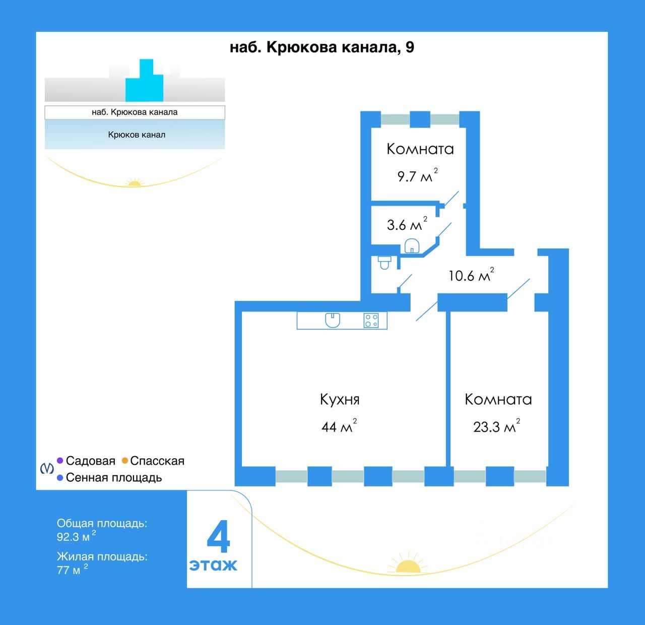 Всё — в тишине и уединении, но в шаговой доступности от культурных жемчужин Петербурга: — Мариинский театр — Лендок — Новая Голландия — Никольский собор и парк — Юсуповский дворец