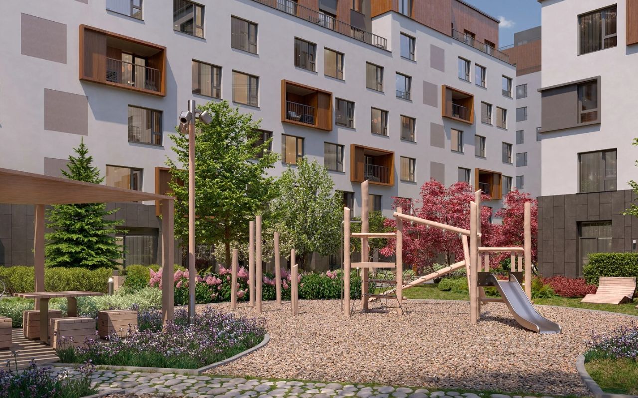 Оживлённое уличное движение останется за пределами квартала, а внутри создается собственная природная среда с зонами для вечерних прогулок, расслабленного отдыха, спорта и игр. Между домов проходит широкий пешеходный бульвар с разнообразным ландшафтом. Он объединяет общественные пространства между кварталами и переходит в площадь-сквер с фонтаном.