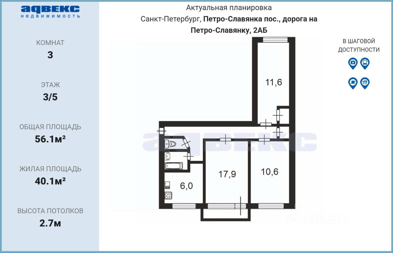 Поликлиника, школы, садики находятся как у метро Рыбацкое, так и в поселке Петро-Славянка - пешком 20 минут. Квартира прекрасно подойдет для семьи, которой надо выделить каждому по комнате, иметь городскую прописку и жить недалеко от метро. По такой цене с такими параметрами конкурентов просто нет.