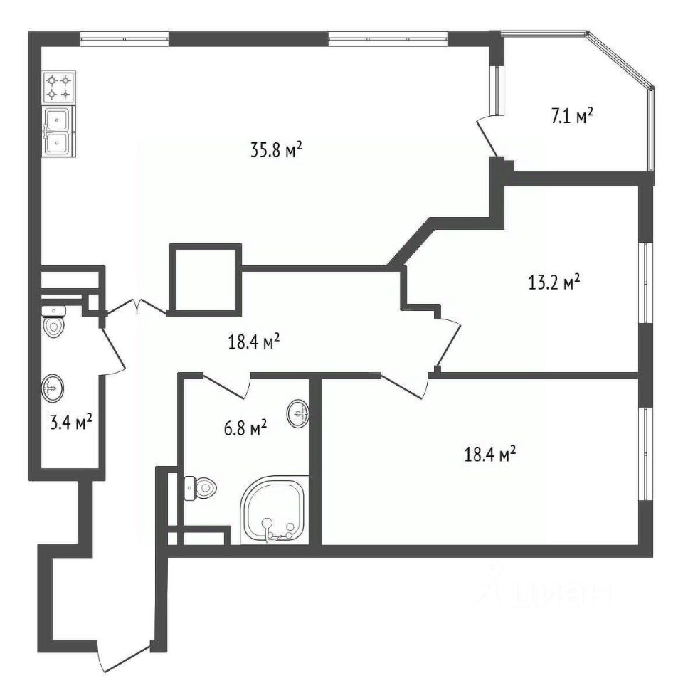 Гостиная-кухня-столовая: 35.8 м2 (окна выходят на запад, в сторону 2 и 3 башни) Лоджия: 7.1 м2 (вид запад и север, в сторону центра) Спальня: 18.4 м2 (вид север, в сторону центра) Детская: 13.2 м2 (вид север, в сторону центра) Холл: 18.2 м2 Ванная: 6.8 м2 Санузел: 3.4 м2