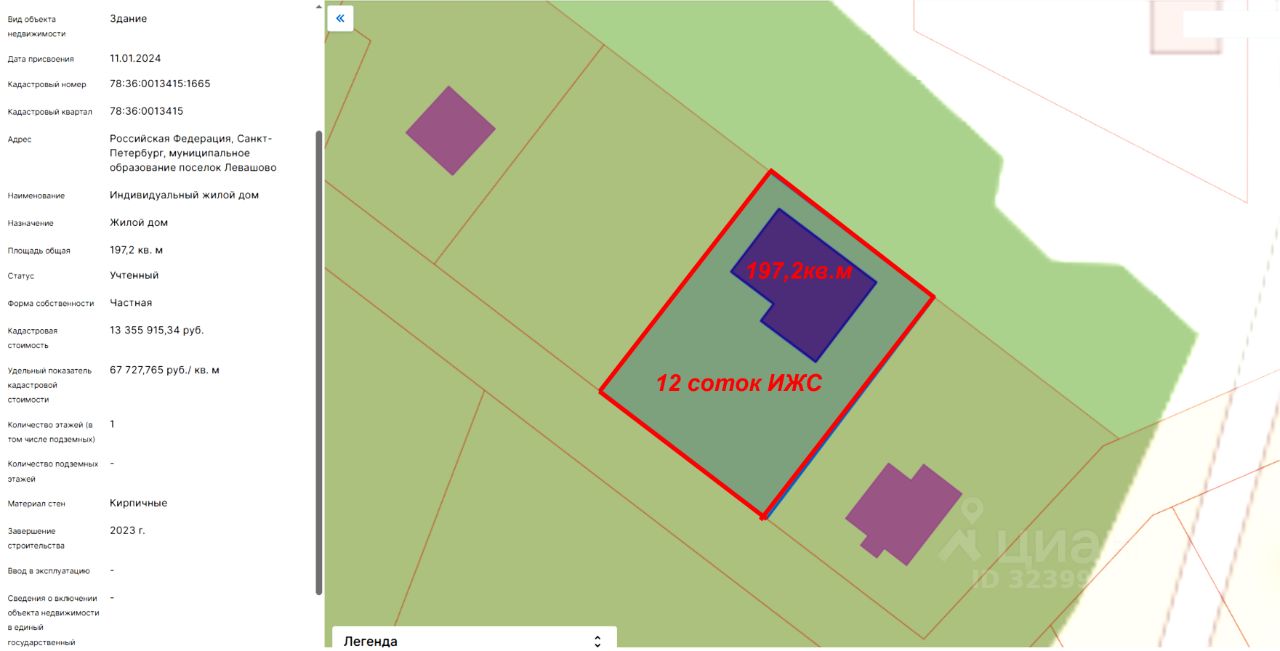 Кадастровые номера: участок 78:36:0013415:1590, коттедж 78:36:0013415:1665. Координаты для навигатора: 60.094783, 30.144374. В 5 км от КАД и ЗСД, пос. Левашово, массив Новоселки, новый коттедж 197кв.м, из бетона, толщина стен 57см, без внутренней отделки. Фундамент ростверк (плита + лента), кровля черепица. Второй этаж большое техническое помещение. Первый этаж: три спальни (16,19 и 22кв.м), гостиная-кухня 51 кв.м, два санузла (1,6 и 9,5кв.м), гардеробная, прихожая, коридор, котельная и крытая терраса 29кв.м. Высота потолков 3,2м. Второй этаж техническое помещение. Отопление теплые полы (от электрического котла, который при подключении газа может стать дублирующим газовому котлу). Коммуникации: 15кВт заведены в дом, канализация станция биологической очистки, собственная скважина. Газ по границе участка. Участок 12 соток ИЖС (не СНТ или ДНП, нет никаких поборов и взносов, обычный поселковый ИЖС с милицейским адресом и пропиской). Участок сухой (выполнена замена грунта и трамбовка), с живописными соснами и елями. За участком примерно 4-5 соток ничейной земли, можно использовать. 100 метров от коттеджа зона отдыха со спортивной и детской площадками. Озеро с песчаным пляжем 200 метров, вокруг поселка курортный лесопарк. Великолепная транспортная доступность участка (до КАД и ЗСД) делает коттедж очень привлекательным для постоянного проживания в городской черте. Рядом населенные пункты: Песочный, Парголово, Сестрорецк, Западная Лица, Юкки, Белоостров, Солнечное, Лисий Нос.