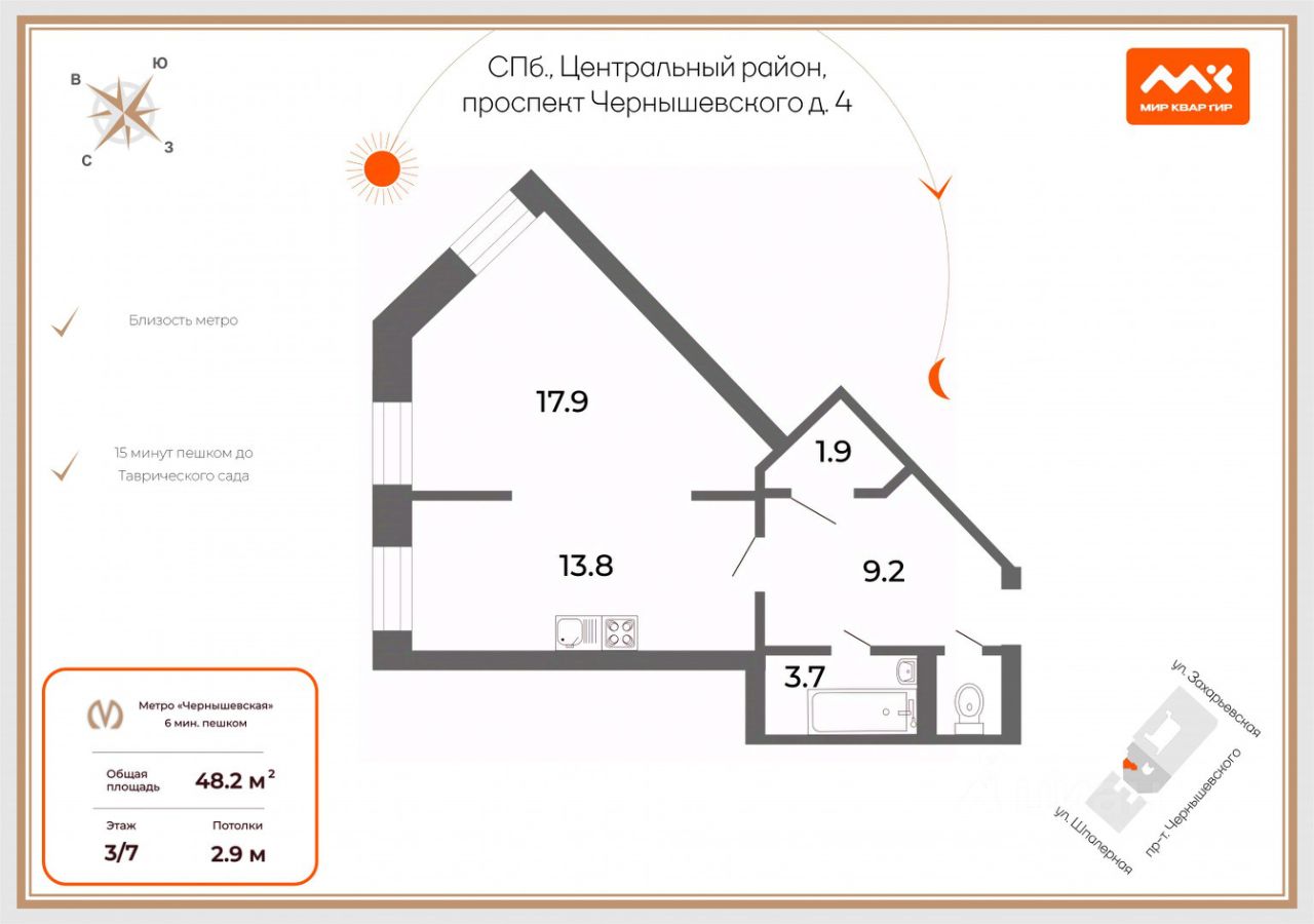 Инфраструктура в Центральном районе отлично развита, поблизости находятся все необходимые социальные объекты, множество объектов сферы услуг: салоны красоты, фитнес-центры, рестораны и кофейни (3 мин пешком). Супермаркет EUROSPAR - 2 мин пешком. Метро Чернышевская - 6 мин пешком! Прямая продажа! Вся сумма в договоре. Приглашаем на просмотры в любое удобное для Вас время! Предлагаем ПРЕМИАЛЬНОЕ обслуживание для требовательных клиентов. Оперативно организуем просмотр, предоставим полную информацию по объекту.