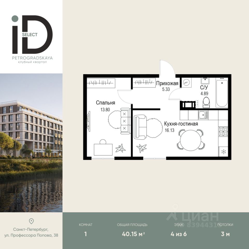 Клубный квартал iD Petrogradskaya на ул. Профессора Попова, 38 объединяет современную архитектуру, удобные планировки и развитую инфраструктуру, предлагая комфортную жизнь в престижном районе Санкт-Петербурга. Из квартир открываются виды на Иоанновский монастырь и реку Карповку. В шаговой доступности три станции метро: ''Петроградская'', ''Чкаловская'' и ''Чёрная речка''. 3-метровые потолки и эксклюзивные планировки создают атмосферу простора и уюта. Внутреннее пространство квартала включает благоустроенные дворы, курдонёры и подземный паркинг. Квартиры площадью от 20 до 136 м² с кухнями-гостиными до 40 м² и террасами с панорамными видами сдаются без отделки, оставляя свободу для индивидуальных интерьерных решений.