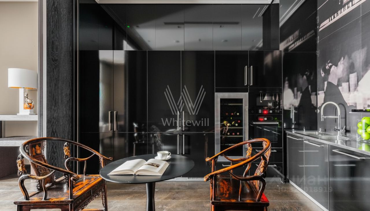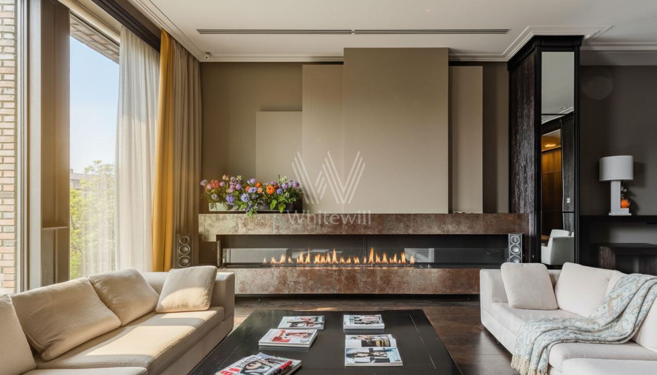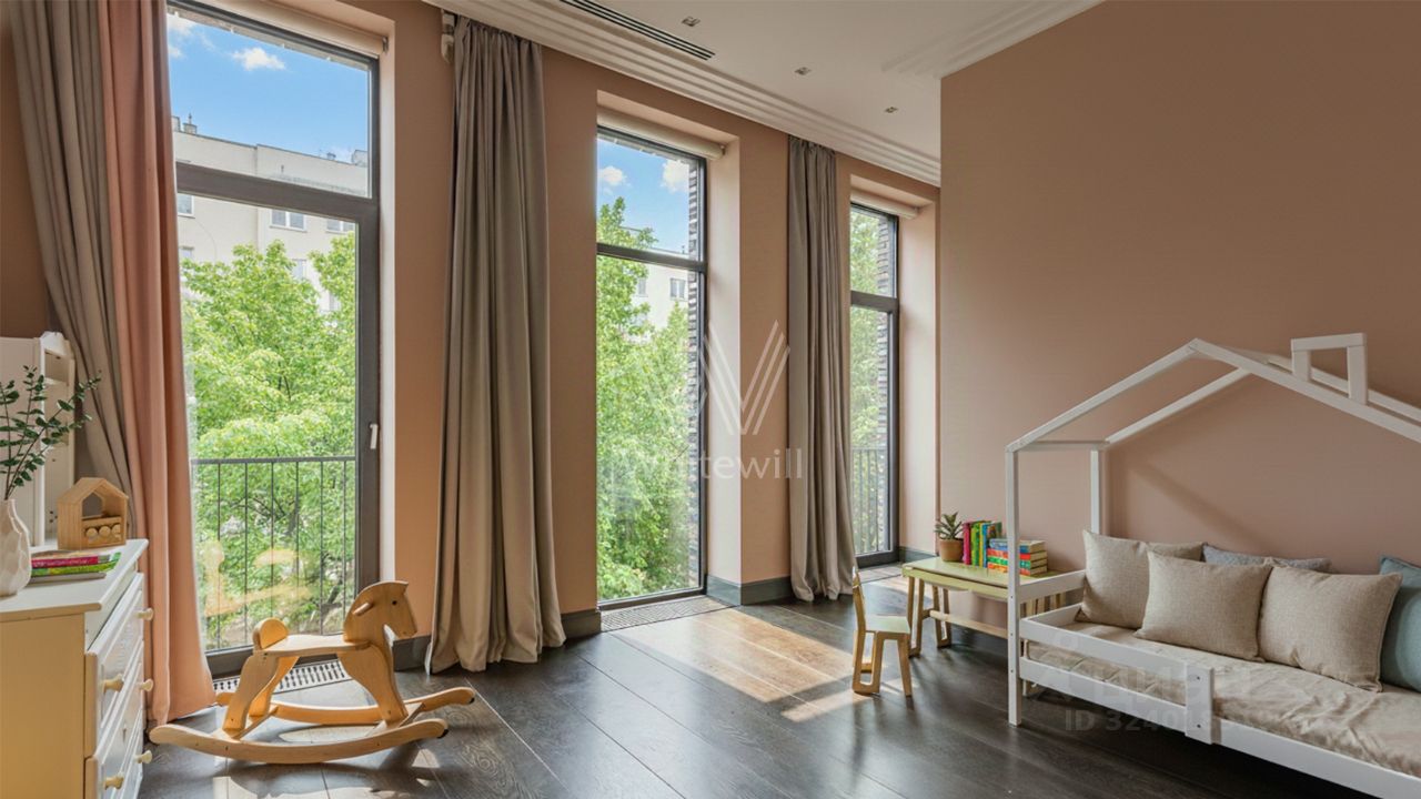Квартира укомплектована мебелью и бытовой техникой. Функциональная планировка включает гостиную с обеденной зоной и биокамином, изолированную кухню, мастер-спальню с собственной гардеробной и санузлом, 2 спальни, 3 санузла, гардеробную и холл. Из окон открываются виды на Серебряническую набережную и благоустроенную территорию комплекса.