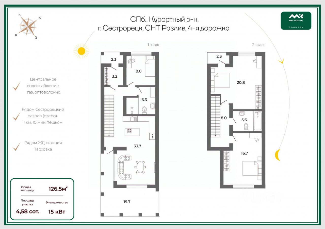 Арт. 111441723 Продается светлый и комфортный дом из газобетона! Расположение: Участок расположен на ровной и сухой местности. Удобный доступ ко всем объектам инфраструктуры: остановка автобуса, аптека, детский сад, магазин и поликлиника находятся в шаговой доступности. В 10 минутах пешей доступности озеро Сестрорецкий разлив. Описание дома: Первый этаж- * Просторная кухня-гостиная площадью 33,7 м², * Гостевая комната, * Санузел с душевой, * Уютная терраса площадью 19,7 м² для летних посиделок. Второй этаж- * Две изолированные спальни с большими окнами, обеспечивающими много естественного света и воздуха, * Санузел с ванной. Инженерия: * Дом обогревается двухконтурным газовым котлом, * Теплый пол на первом этаже и в санузле второго этажа, батареи в спальнях. *Центральное водоснабжение, *Центральное газоснабжение, *Кондиционер, *Интернет.