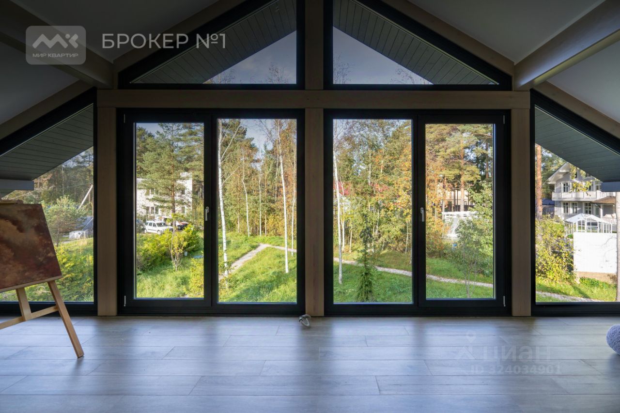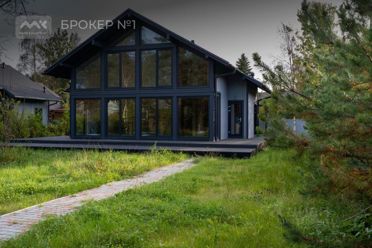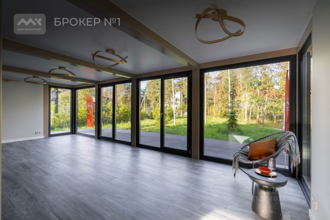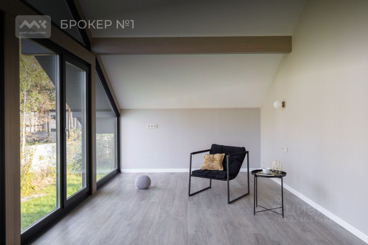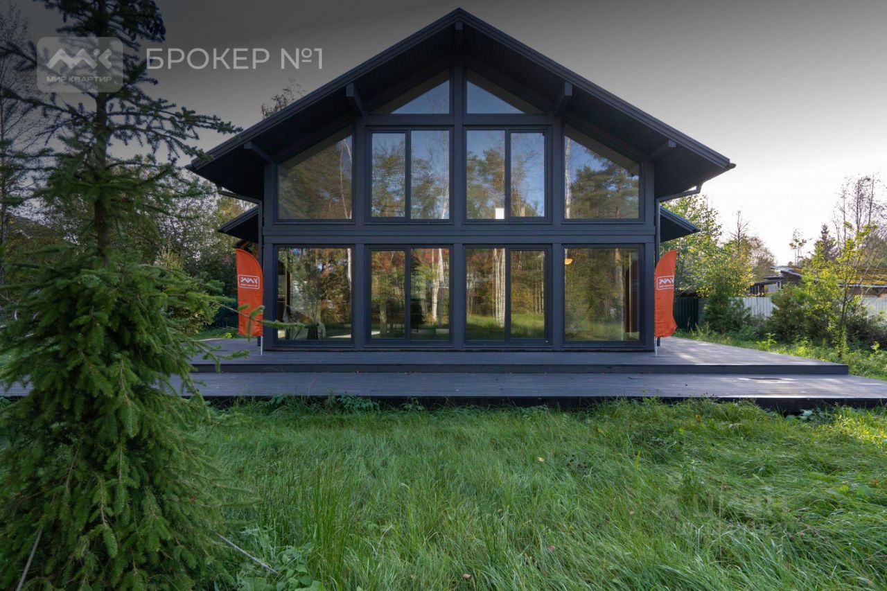 Дом из клееного бруса. Изнутри утеплён СИП-панелями. Фасад стеклянный. Снаружи стены обшиты доской. На крыше мягкая кровля. Электричество 15 кВт, с возможностью увеличения.