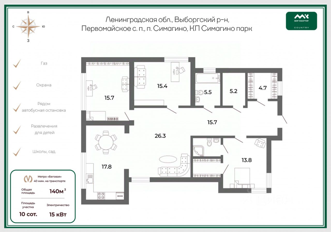 Дополнительные преимущества включают централизованное водоснабжение, газ, электричество 15 кВт, септик, построенный забор и благоустроенный участок с газоном и дренажной системой. Поселок полностью огорожен, обеспечен круглосуточной охраной, видеонаблюдением и контролем доступа. Расположение поселка предлагает уникальные возможности для активного образа жизни: близость к озерам, эко-парку ''Вереск'', горнолыжному курорту ''Пухтолова гора'' и побережью Финского залива с его прекрасными пляжами и ресторанами.