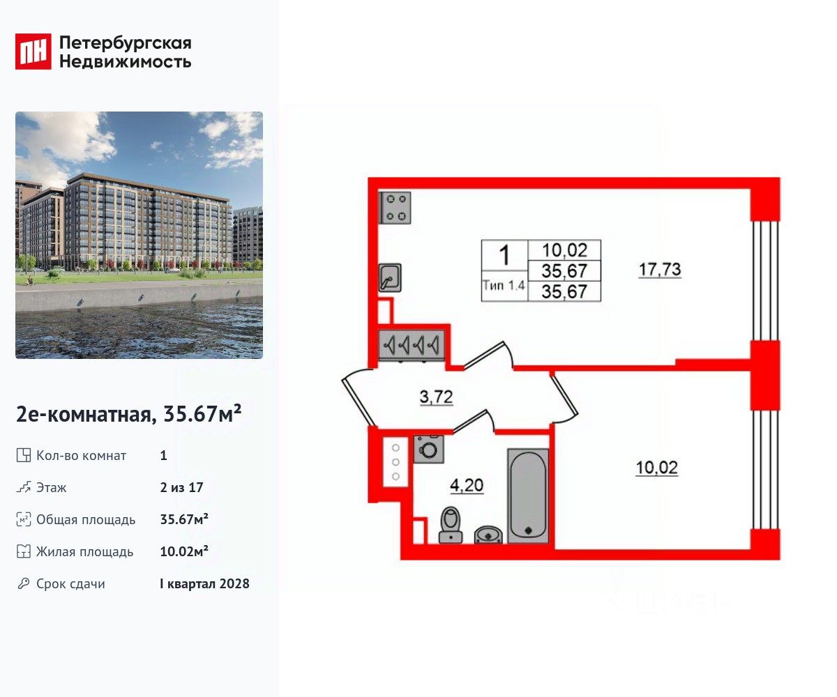 Удобная, классическая, функциональная европланировка, большая кухня-гостиная 17.73 м², вместительная прихожая 3.72 м². Общая площадь квартиры - 35.67 м², жилая 10.02 м², высота потолка 2.77 м.