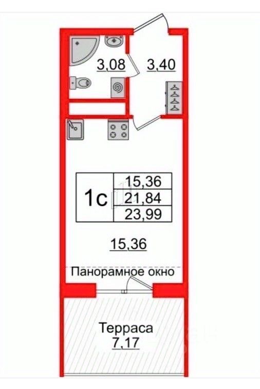 О КВАРТИРЕ: - Общая площадь 21.9 кв. м. - Высокие потолки 3.2 м., что создает атмосферу простора. - Панорамные окна. - Терраса 7.10 кв. м. - Качественная отделка в светлых тонах. - Окна выходят на благоустроенный двор.