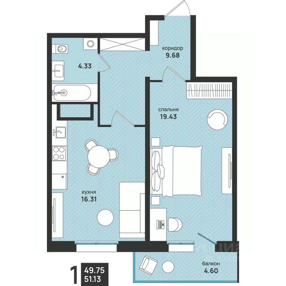 Общая площадь51,13 м2