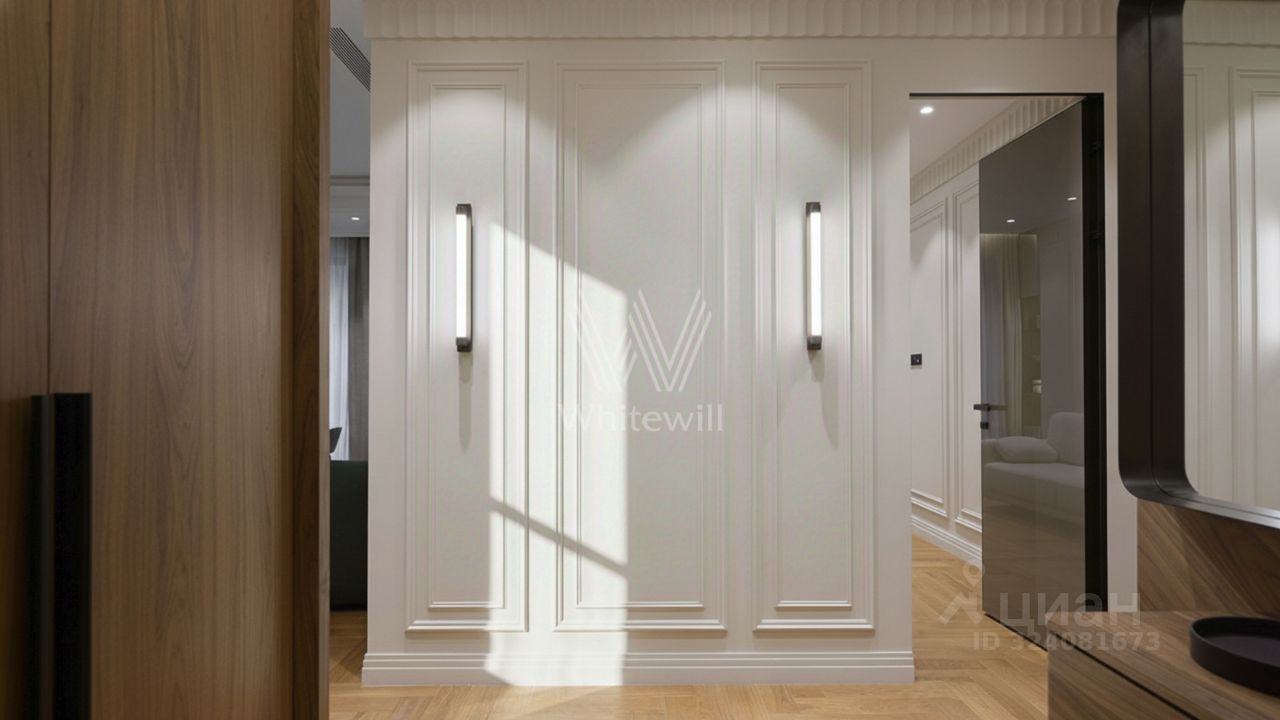 Мастер-спальня дышит бежевыми туманами. Кровать будто парит над полом, геометрия гарнитура вписана в единую линию, а латунный светильник расставляет точки над ''и''. Настенная панель с тонкими световыми швами ведёт взгляд, не повышая голос. Элегантное трюмо выслушает все ваши секретики.