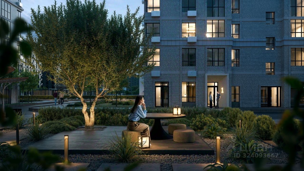 Архитектурные решения дополнены специальным освещением, которое подчеркивает фасады зданий и создает выразительный облик комплекса в вечернее время.