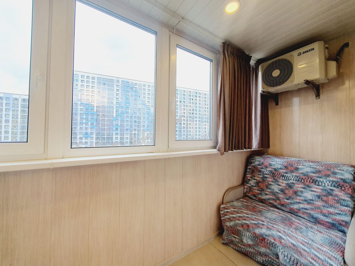 Просторная лоджия площадью 5,2 м2 (не учтена в площади квартиры) утеплена и превращена в маленькую комнату. Двухкамерные стеклопакеты, проведено освещение, пол с подогревом. На лоджии поместился небольшой диванчик и вместительный шкаф.