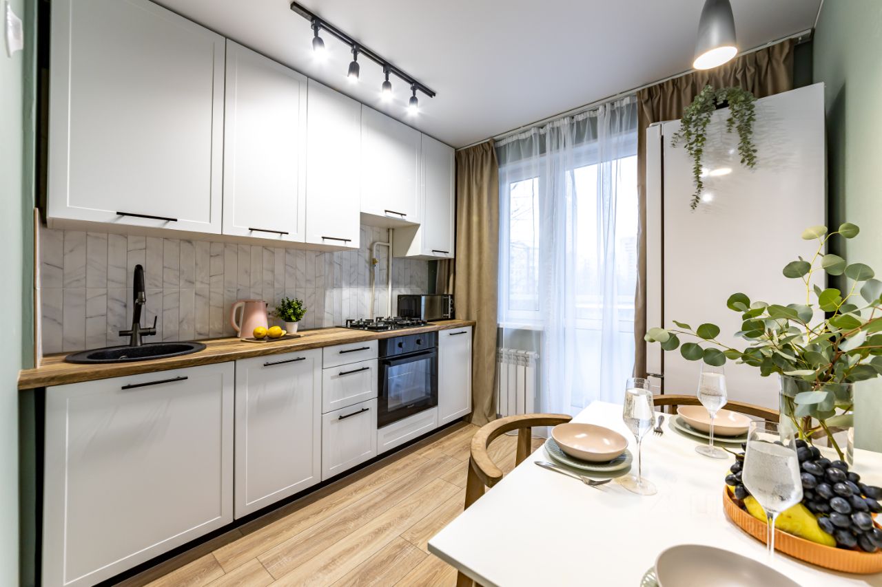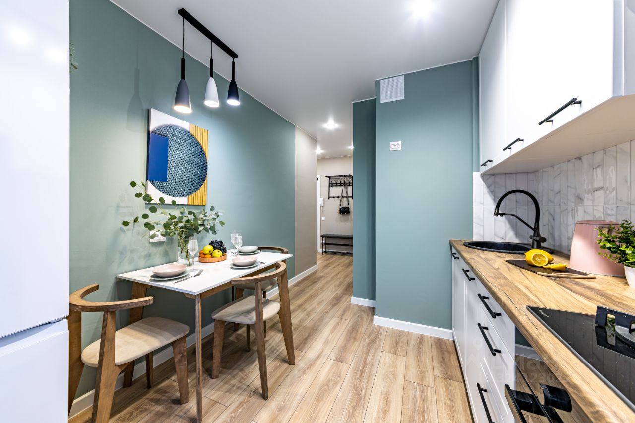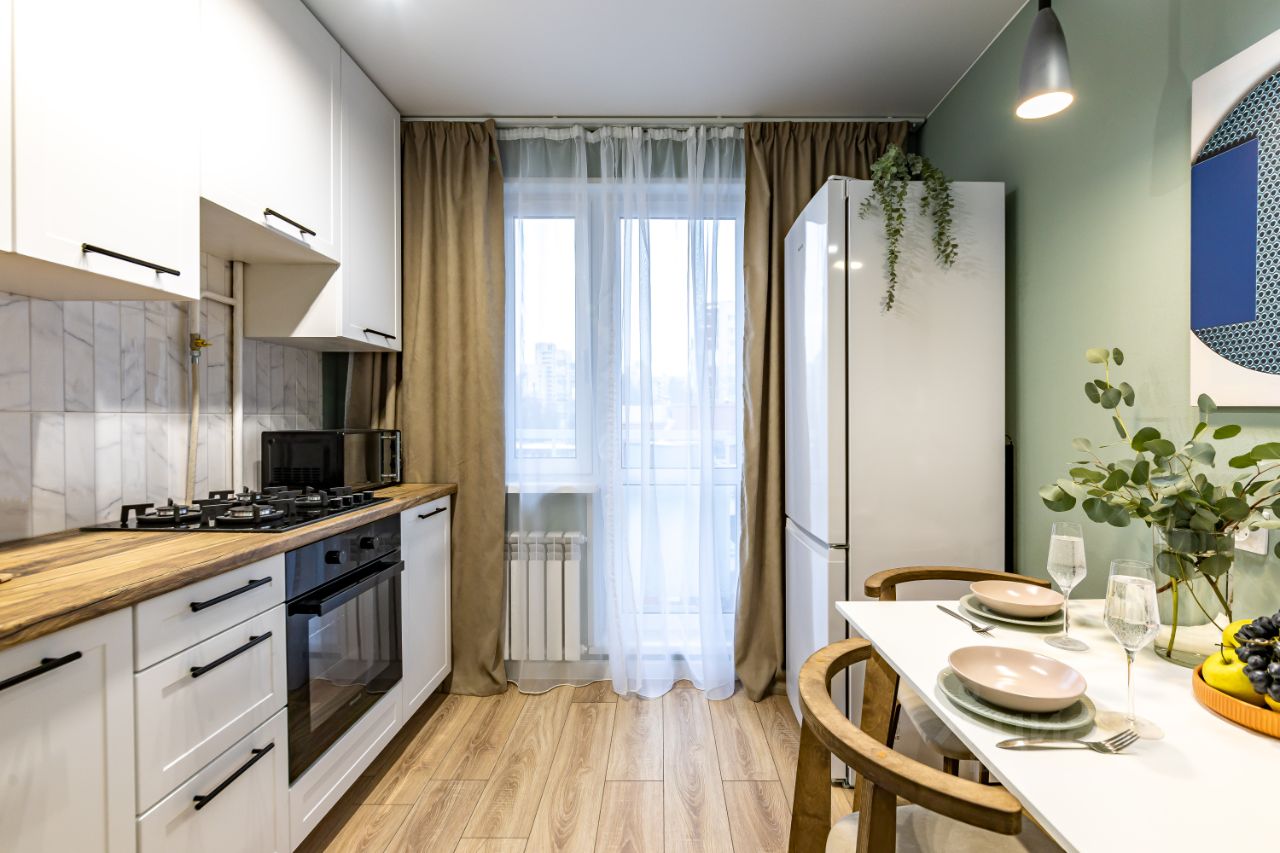 Кухня полностью укомплектована качественной мебелью и техникой: посудомоечная машинка, холодильник, духовой шкаф, варочная поверхность.