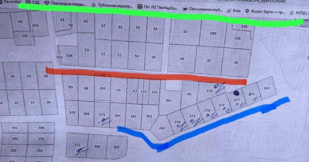 Продается ровный и сухой участок правильной формы. Межевание есть. Земли нас.пунктов, ИЖС. По соседней улице проходит газ. В домах рядом с участком газ заведён. На плане салатным цветом выделено Гатчинское ш., красным цветом- газ-магистраль, синим - наш проезд, который местная Администрация сделает, когда соседние участки зарегистрируют свои права. Автобусная остановка в 5 мин. пешком. Транспорт идёт, как до СПб, так и до г. Гатчина.