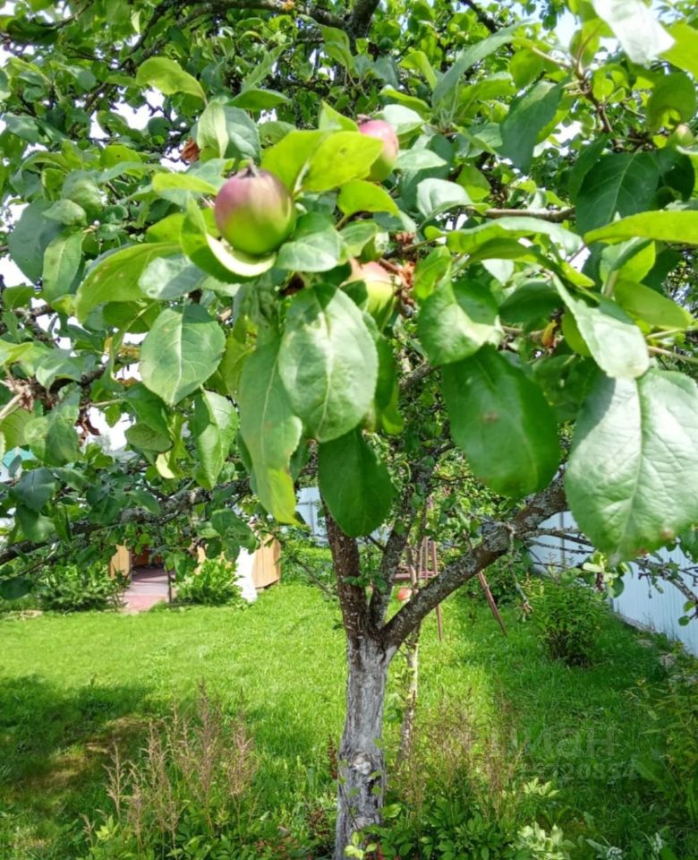 На участке растут ель, плодовые деревья и кустарники, цветы.