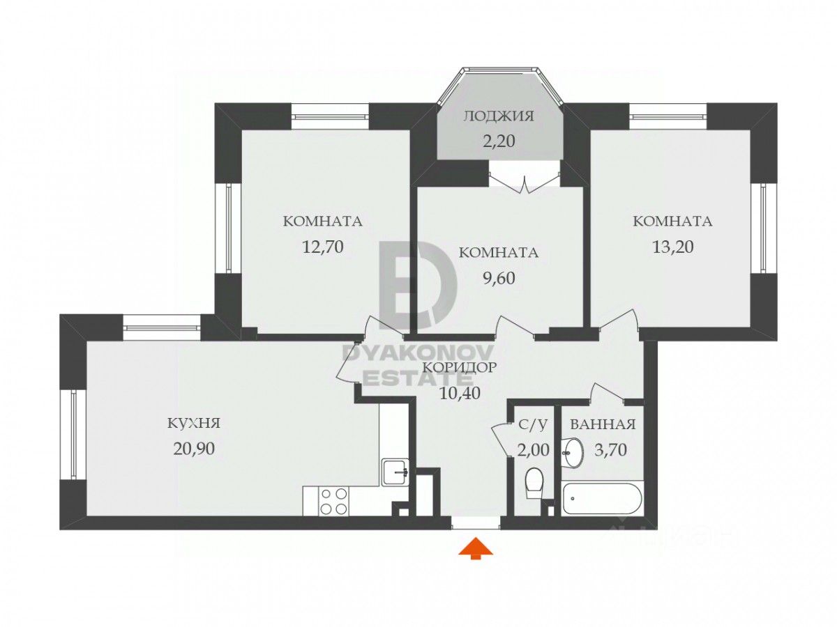 О КВАРТИРЕ: В квартире действительно комфортная планировка: - Кухня-гостиная - 20,9 м - Изолированные комнаты правильной формы - 13,2 м, 9,6 м и 12,7 м - Два санузла - 3,7 м и 2 м - Просторная прихожая - 10,4 м - Потолки - 2,7 м