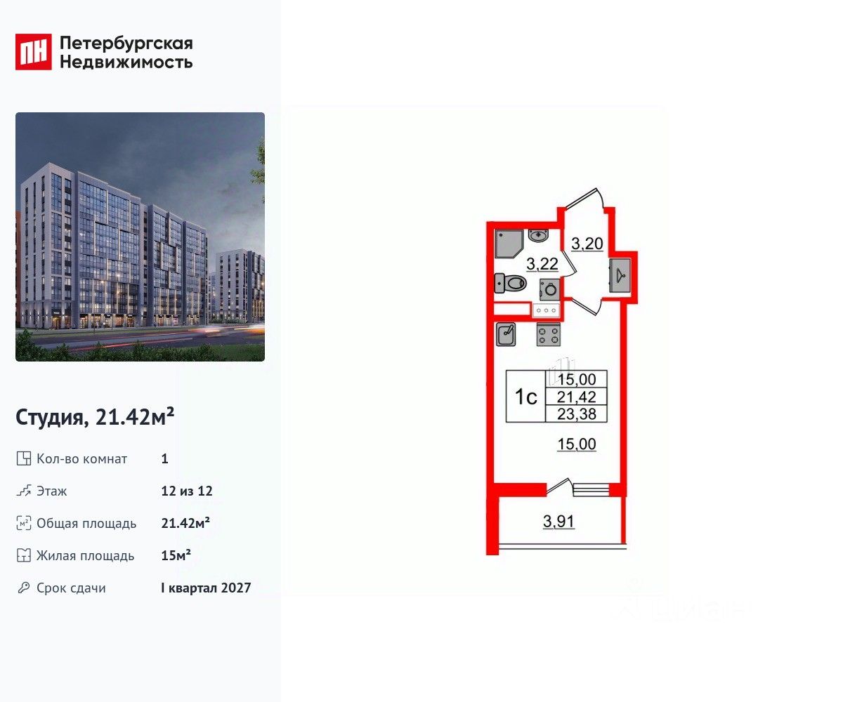 Удобная, классическая, функциональная европланировка, просторная прихожая 3.2 м². Общая площадь студии - 21.42 м², жилая 15 м², высота потолка 3 м.