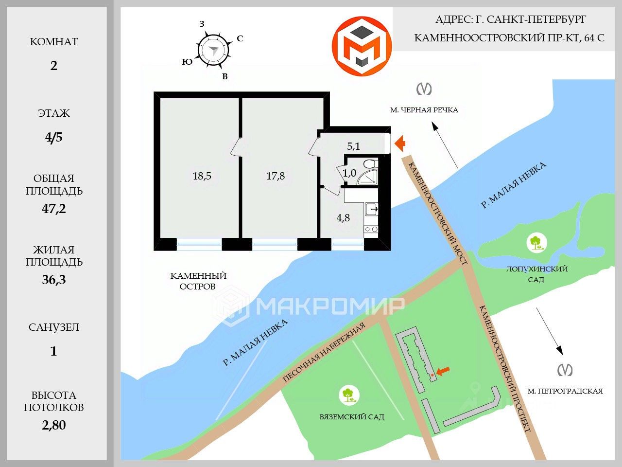 До 3 станций метро (Петроградская, Черная речка, Чкаловская) 15-17 минут пешком. Общественный транспорт на проспекте в центр и на север города.