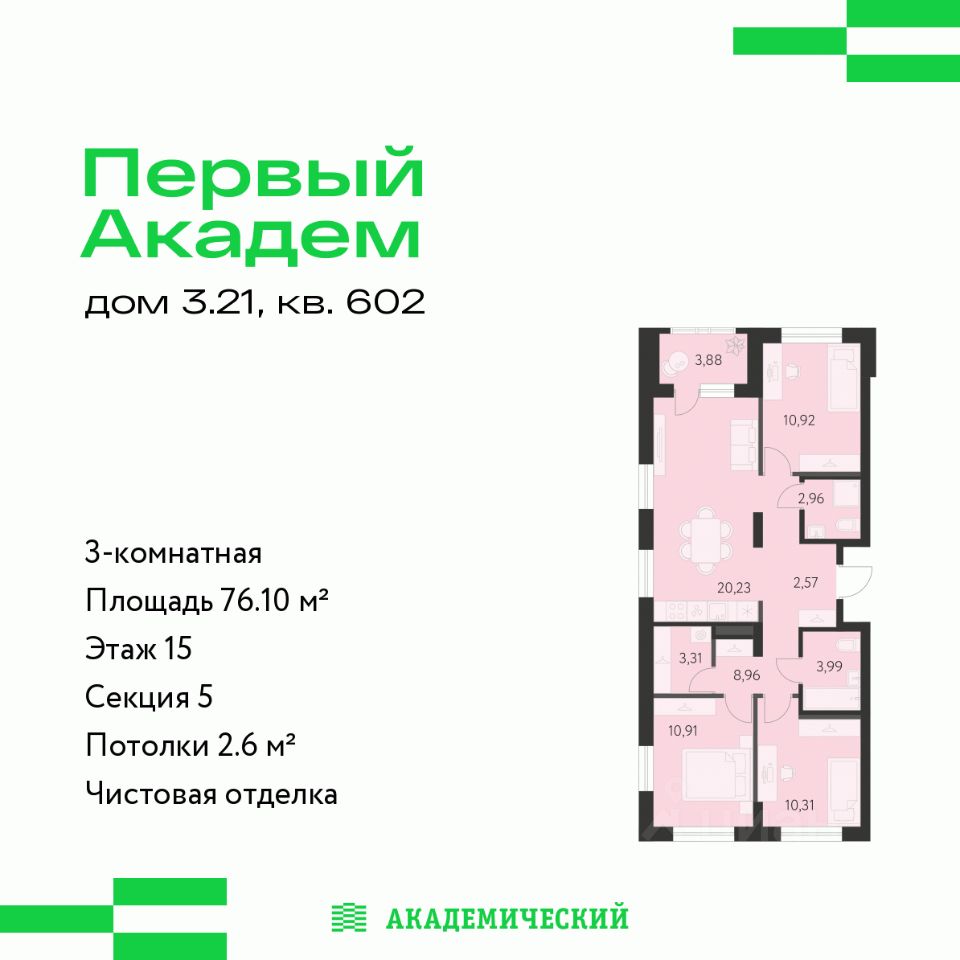 Продается 3-комнатная квартира площадью 76.1 кв.м. от девелопера ''Академический'' в жилом квартале ''Первый Академ''. Срок сдачи дома в 2028 году. Выгоды и скидка напрямую от застройщика.