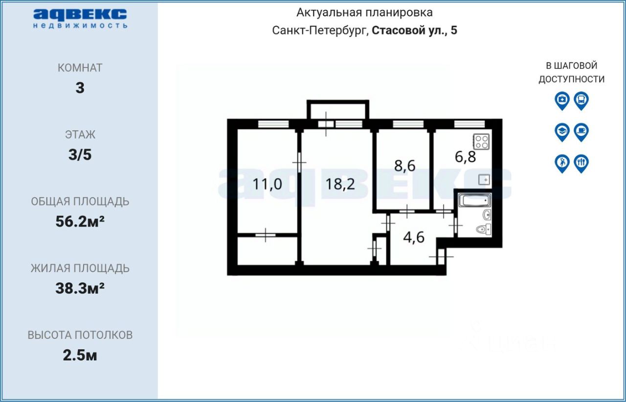 ID: 1915456 Предлагается к продаже трехкомнатная квартира, расположенная в Красногвардейском районе Санкт-Петербурга по адресу: улица Стасовой, дом 5. Общая площадь квартиры составляет 56,2 квадратных метра, включая три комнаты площадью 18,7, 11,0 и 8,6 квадратных метров соответственно, а также кухню площадью 6,8 квадратных метров.