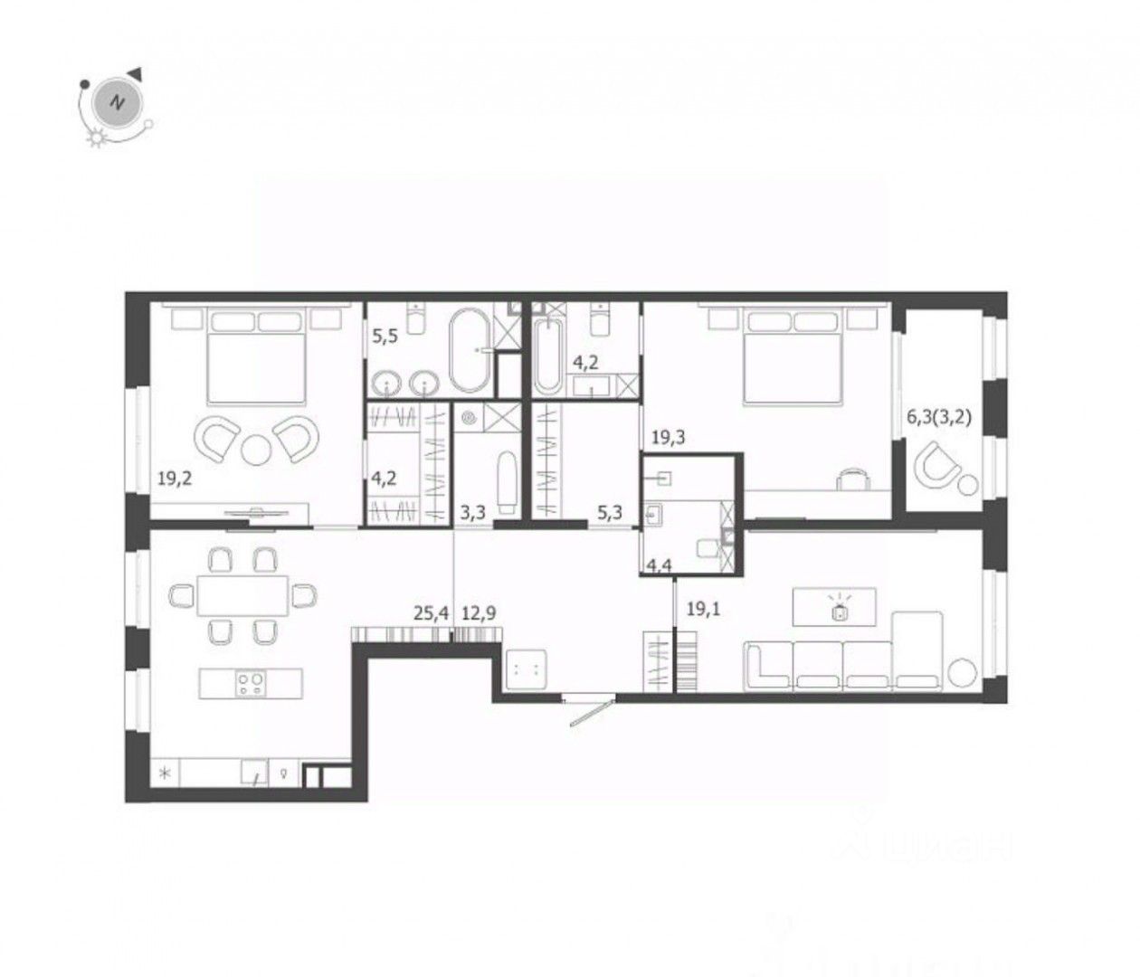 Полноценная трехкомнатная квартира: -Кухня-гостиная с двумя окнами 25 м -Две мастер-спальни с собственным санузлом и гардеробной -Третья спальня/детская/кабинет.