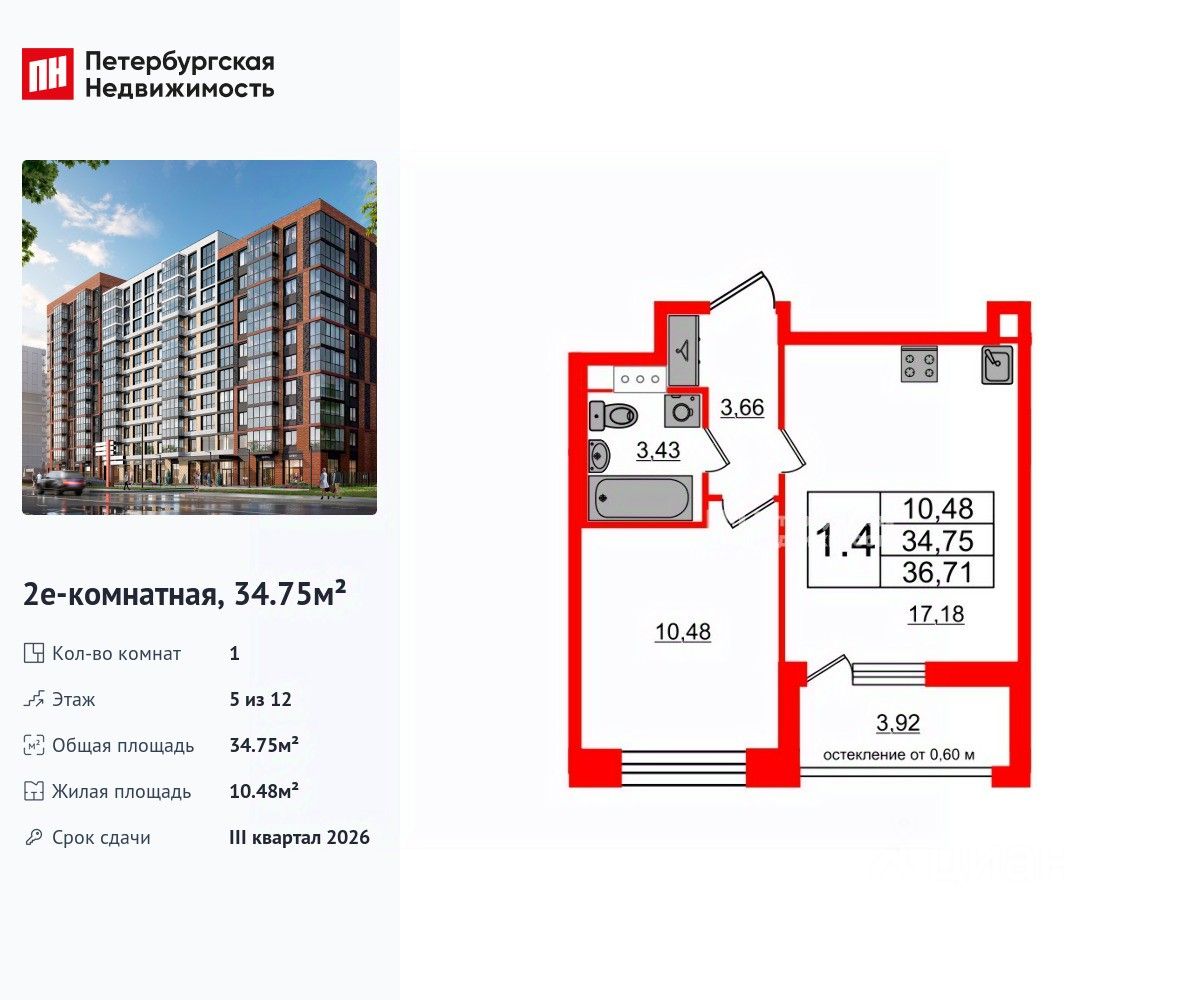 Удобная, классическая, функциональная европланировка, большая кухня-гостиная 17.18 м², вместительная прихожая 3.66 м². Общая площадь квартиры - 34.75 м², жилая 10.48 м², высота потолка 2.77 м.