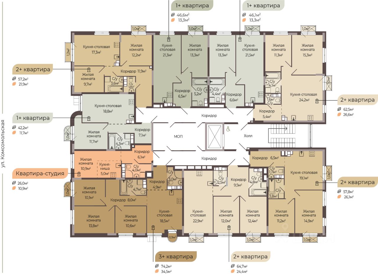 ''Трио'' — это новый жилой комплекс комфорт-класса, который расположится на Комсомольской улице в Автозаводском районе Нижнего Новгорода. ЖК ''Трио'' состоит из трёх ярких одноподъездных корпусов. Высота каждого корпуса не превышает 8 этажей. А это значит, что дом будет ''камерный'', с небольшим количеством соседей, которые станут настоящими друзьями. В ЖК ''Трио'' запроектировано 7 видов планировочных решений площадью от 24,8 кв.м. до 89 кв.м. Всего в комплексе будет 200 квартир. Важным преимуществом является наличие кладовых, которые будут располагаться на 1 этаже. Благоустроенный закрытый двор с площадками для детей разных возрастов, зонами отдыха для взрослых и придомовой территорией с озеленением — станет любимым местом для прогулок. Для комфортного проживания и безопасности будущих жильцов в комплексе запроектировано 146 машиномест на прилегающей территории, что реализует концепцию жилого комплекса ''Двор без машин''. Приобретая квартиру в ЖК ''Трио'', вы обретаете новое качество жизни в уже сформировавшейся инфраструктуре, где в пешей доступности располагаются детские сады и школы, поликлиники и ветеринарные клиники, супермаркеты и торговые центры, остановки общественного транспорта, парикмахерские и т.д. Срок сдачи дома - 4 кв. 2026 г. Цена указана с максимальной скидкой 10%. Цена действует при 100% оплате стоимости приобретаемого объекта или ипотеке. В зависимости от уровня первоначального взноса применяется скидка от 1-9% (при приобретении квартиры в рассрочку). Уточняйте подробные условия и наличие квартир в офисе продаж, записывайтесь на консультацию!