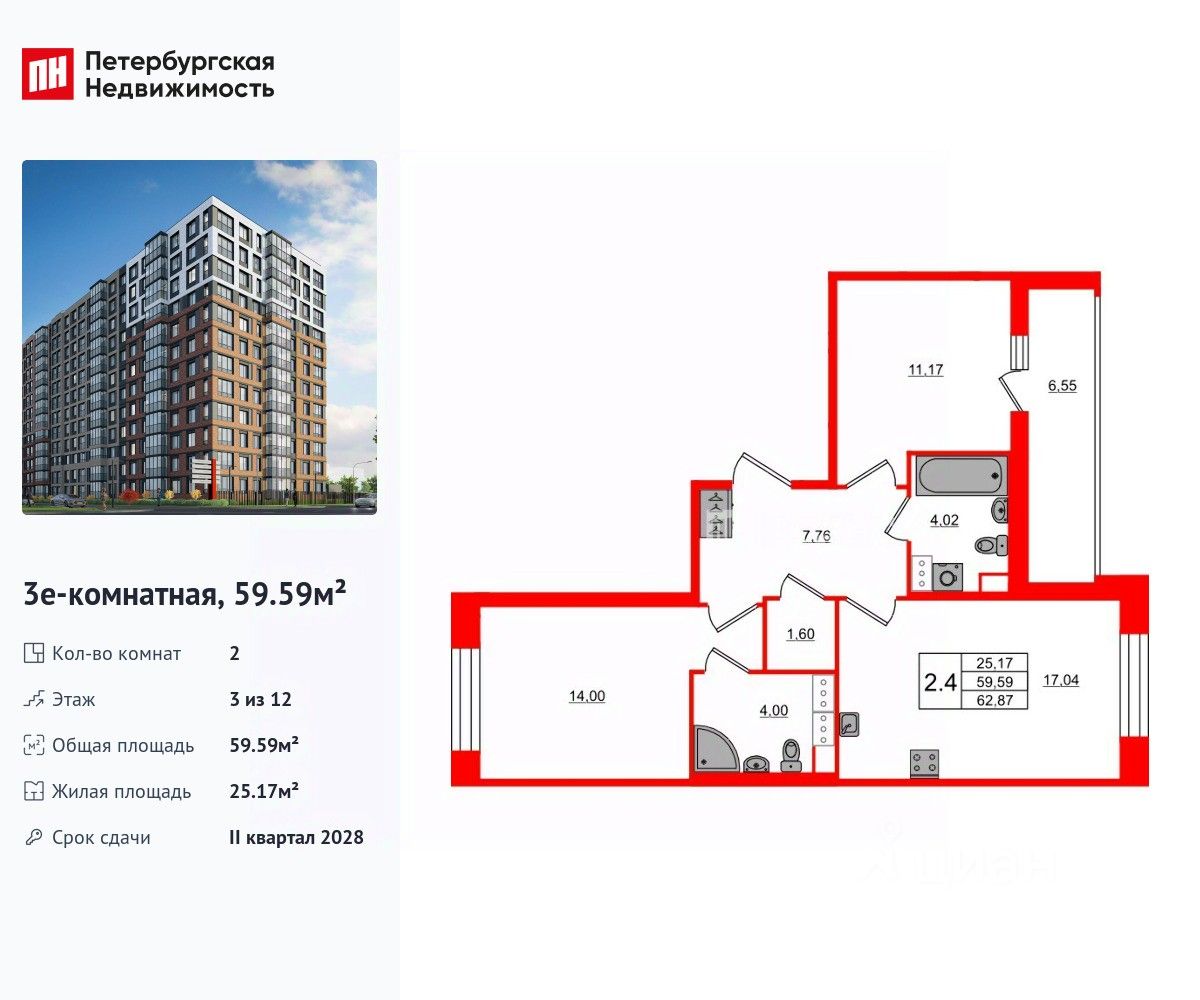 Удобная, классическая, функциональная европланировка, большая кухня-гостиная 17.04 м², вместительная прихожая 7.76 м². Общая площадь квартиры - 59.59 м², жилая 25.17 м², высота потолка 2.77 м.