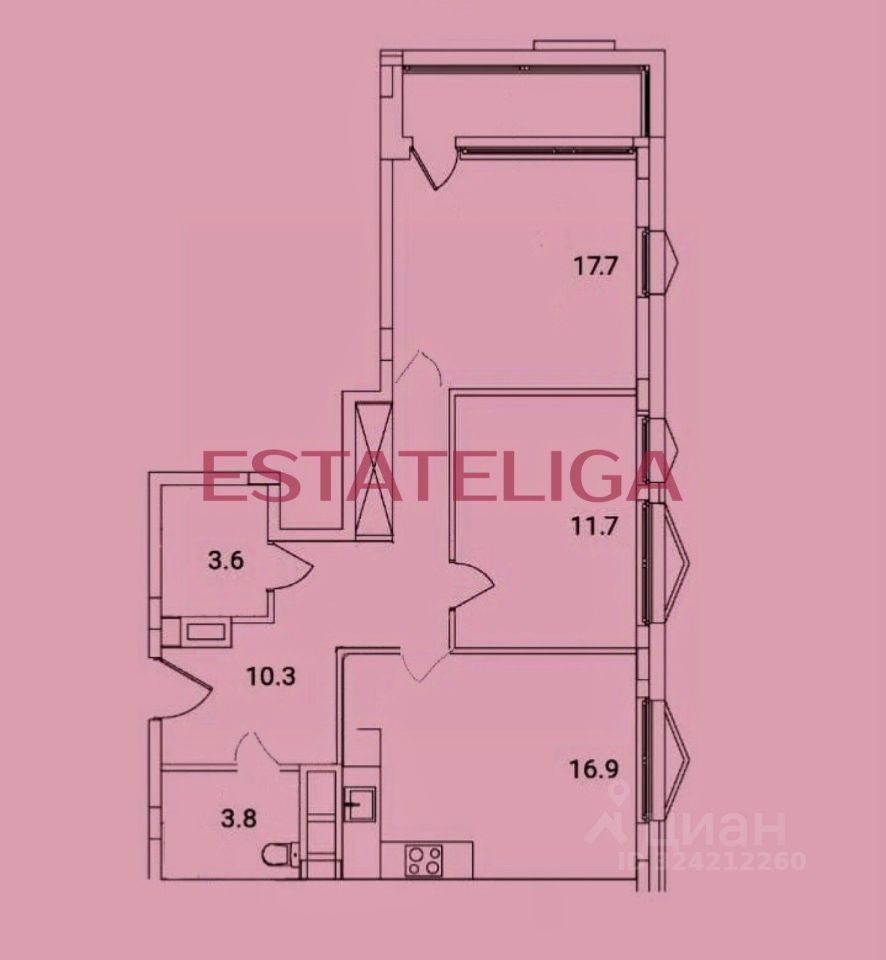 Планировка включает 2 изолированные комнаты, кухня-гостиная 17 кв.м и отдельную гардеробную.