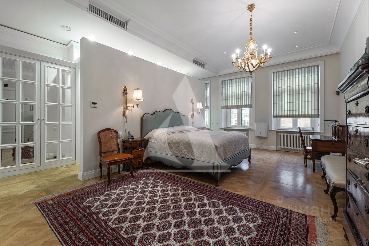 Квартира впечатляет мастер спальней с гардеробной и собственной ванной комнатой с окном, просторной гостиной и кухней-столовой. В отделке используется лепнина и изразцовые печи, которые имеются в каждой комнате, что подчеркивает её исторический и роскошный характер. Высокие потолки и тщательно выполненные детали создают атмосферу аристократического уюта.
