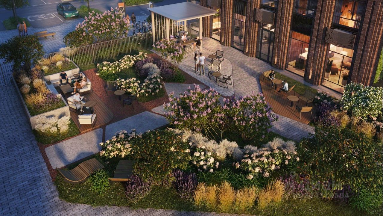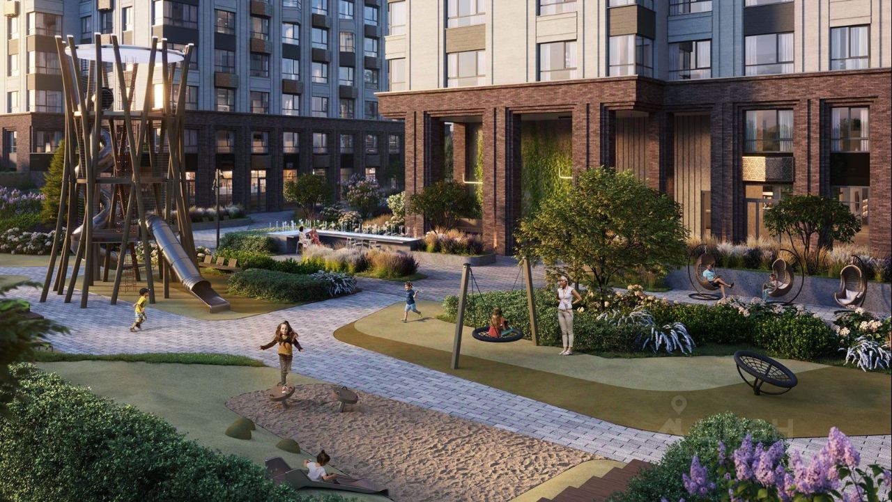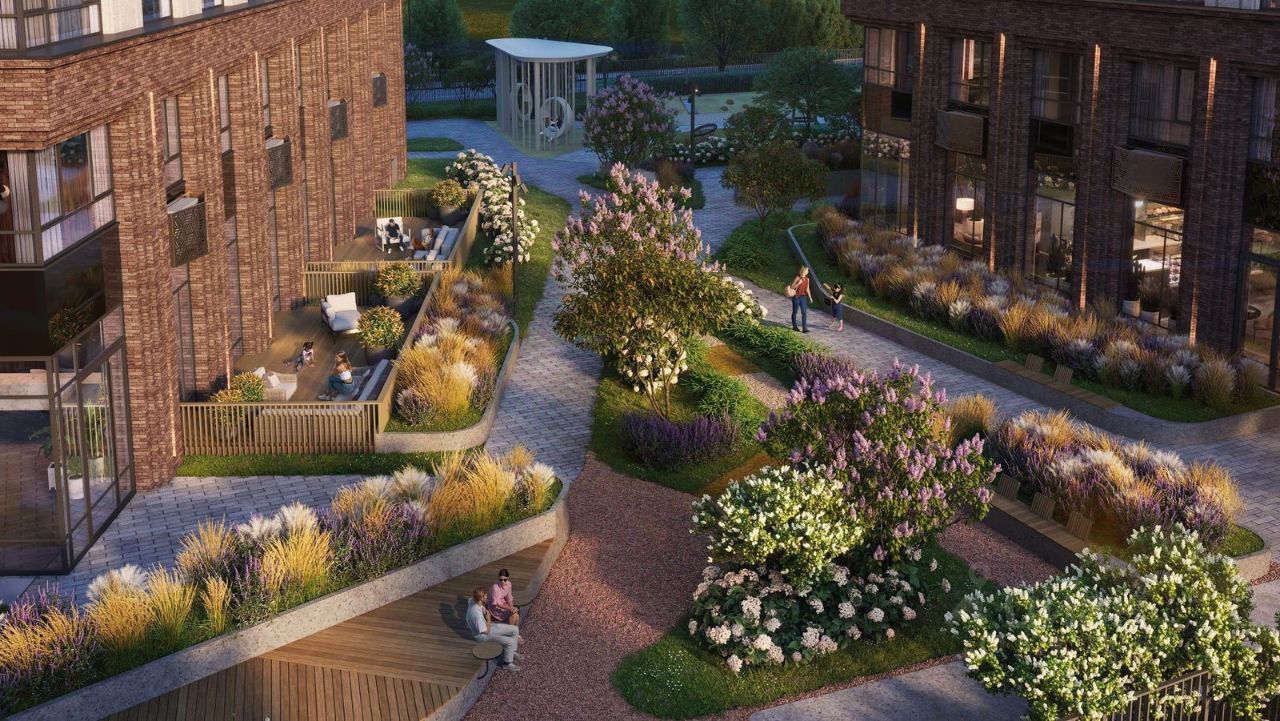 Квартал состоит из четырех 27-этажных домов. В домах — уютные студии, однокомнатные, двухкомнатные, семейные трехкомнатные квартиры. А для ценителей редких форматов квартиры с террасами. Парадный вестибюль с камином и кафе, двор с лаунж-зонами, фонтаном, сенсорным садом, детскими и спортивными площадками внутри.