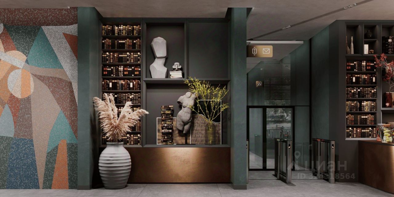 • Общественные пространства Интерьер вестибюля с кофейней, камином и панорамными видами выполнен в благородных приглушенных тонах с авторским панно из мозаики.