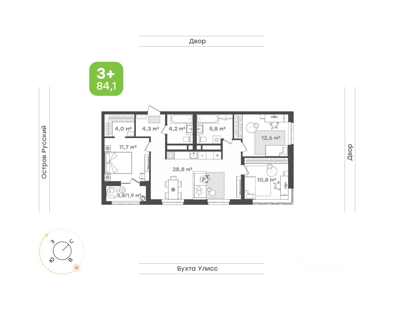 Кухня-столовая 28,8 кв.м станет настоящим сердцем квартиры, где можно готовить семейные завтраки и ужины, а также проводить время в кругу близких людей