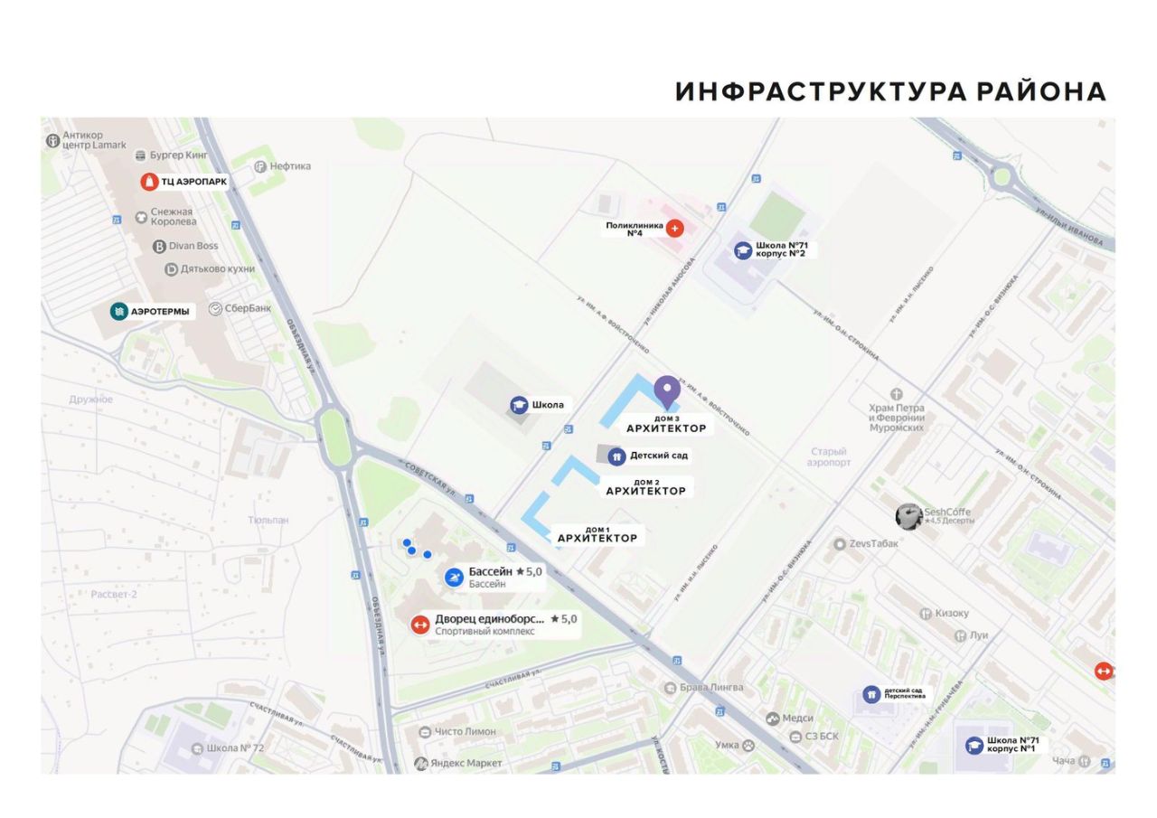 Всего в 7 минутах пешком вы найдете магазины, кафе, аптеки, студии красоты, пункты выдачи маркетплейсов, мед. центр ''Медси'', школа иностранных языков, детские центры развития.ТЦ ''Аэропарк''. Совсем скоро рядом откроют филиал Поликлиники 4 и новую корпус школы 71.
