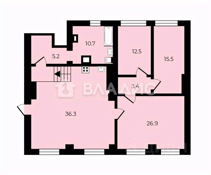Квартира расположена на первом и втором этаже 15-этажного кирпично-монолитного дома 1982 года постройки. Высокие потолки (3,3 м) и просторные комнаты (12,5 + 15,5 + 26,9 кв. м)