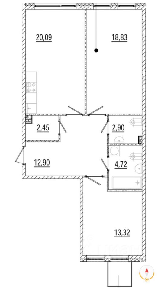 Просторная зона дня: Большая светлая кухня-гостиная. Зона ночи: Две изолированные комнаты (спальня и детская/кабинет). Удобства: Два раздельных санузла и вместительная гардеробная.