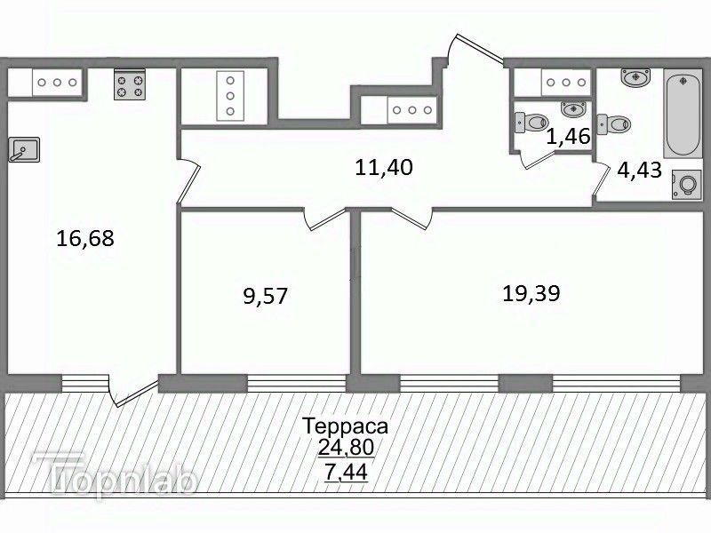 Квартира расположена на 14-м, последнем этаже, общей площадью 70.27 кв.м. Большая терраса 24.80 кв.м. Удобная планировка. Два санузла. Квартира близко к лифтам. Квартира видовая, окна на улицу.