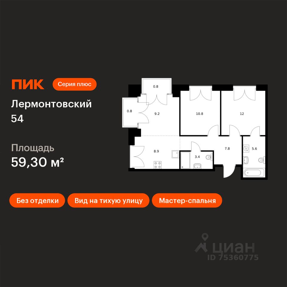 Продаётся 2-комн. квартира площадью 59,3 кв.м на 2 этаже 7 этажного дома (Корпус 2.1, Секция 1) проекта ПИК Лермонтовский 54. Светлый просторный подъезд на уровне земли, функциональная планировка, большие окна, без отделки.