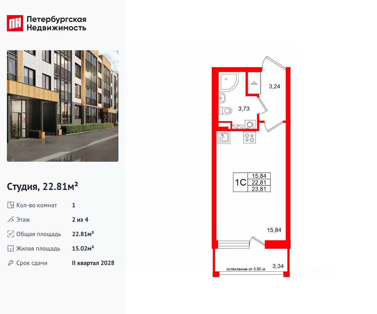 Удобная, классическая, функциональная европланировка, вместительная прихожая 3 м². Общая площадь студии - 22.81 м², жилая 15.02 м², высота потолка 2.77 м.