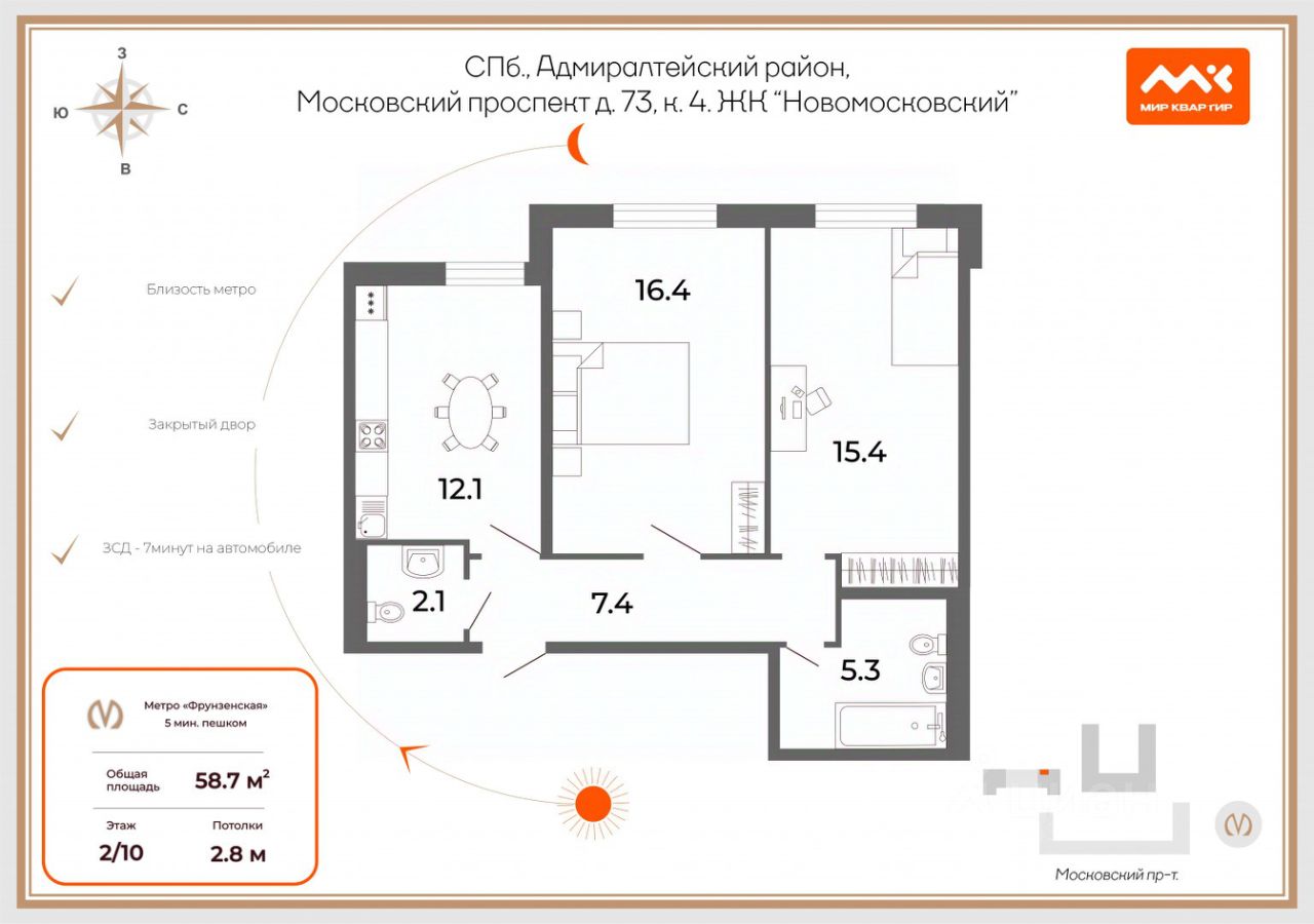 Арт. 126643553 Предлагается к продаже 2-комнатная квартира площадью 59 кв. м в одном из лучших корпусов ЖК бизнес-класса ''Новомосковский''. Жилой комплекс расположен по адресу Московский проспект, д. 73, корп. 4, в непосредственной близости от ст. метро ''Фрунзенская'' 5 минут пешком! Архитектурное решение дома в монументальной стилистике ''сталинских времен'' отлично сочетается с местной инфраструктурой. Лаконичность, строгость композиции, архитектурная индивидуальность. Декоративная отделка наружных стен выполнена с помощью светлых панелей. Для облицовки первых этажей использовалась качественная керамогранитная плитка. Застройщик проекта компания ''ЮИТ ДОМ''. Построен в 2015 году. В квартире установлены металлопластиковые стеклопакеты с технологией микропроветривания. Квартирные двери стальные, усиленные, со звукоизоляцией и фурнитурой ABLOY. Финские радиаторы отопления PURMO с терморегуляторами. Инженерия комплекса включает бесшумные лифты KONE, постоянную вентиляцию с принудительным притоком. Квартира расположена на комфортном 2 этаже. Окнами на юго-запад. Планировка: просторная прихожая с гардеробной, кухня 12 кв.м (вся кухонная техника BOSH), комнаты 16,4 кв.м и 15,4 кв м, гостевой с\у, а также ванная с с\у. Высота потолков 2.7 метра. Все окна квартиры смотрят на уютный сквер и никаких автомобилей и чужих окон перед вами!