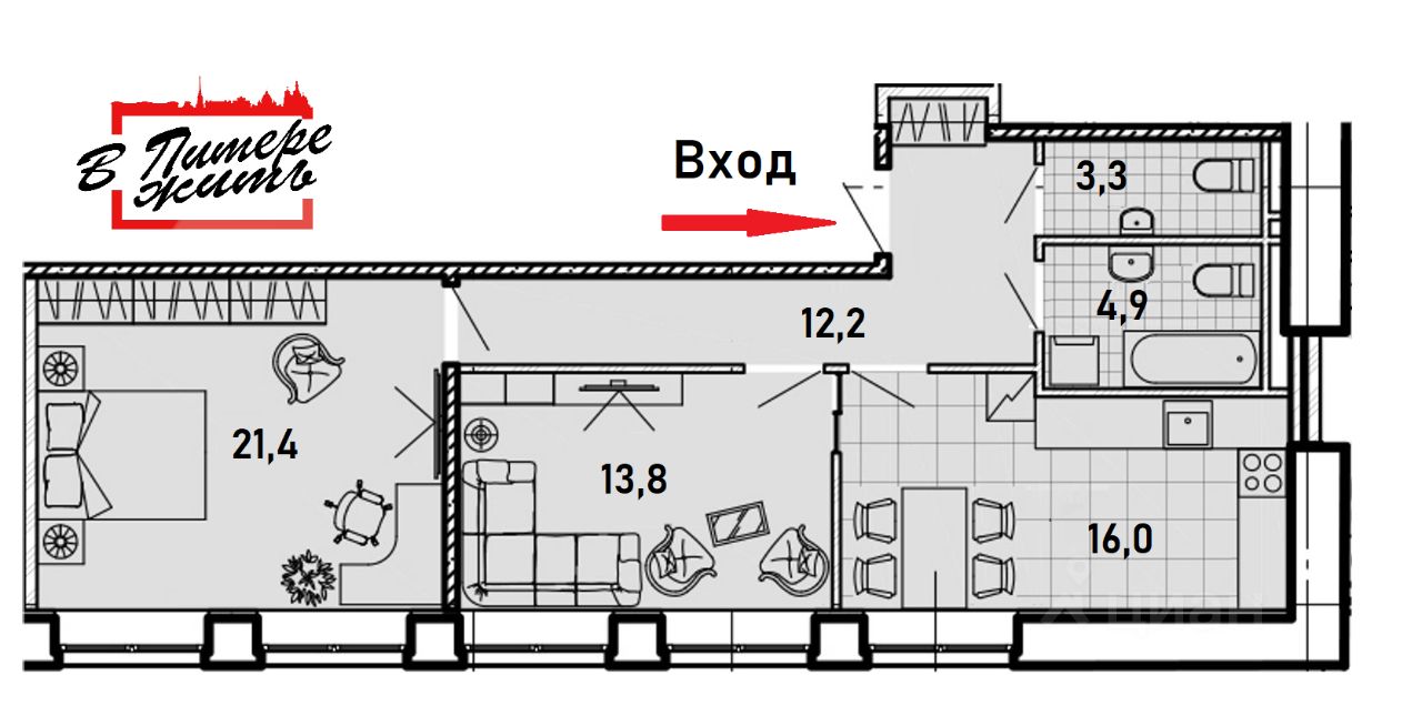 ЖК ''Мадонна Бенуа'' - жилой комплекс премиум класса, 2022 года постройки от ТОПового застройщика Еврострой. В квартире удобная функциональная планировка: две комнаты: 21,4 кв.м. + 13,8 кв.м., кухня гостиная 16 кв.м.