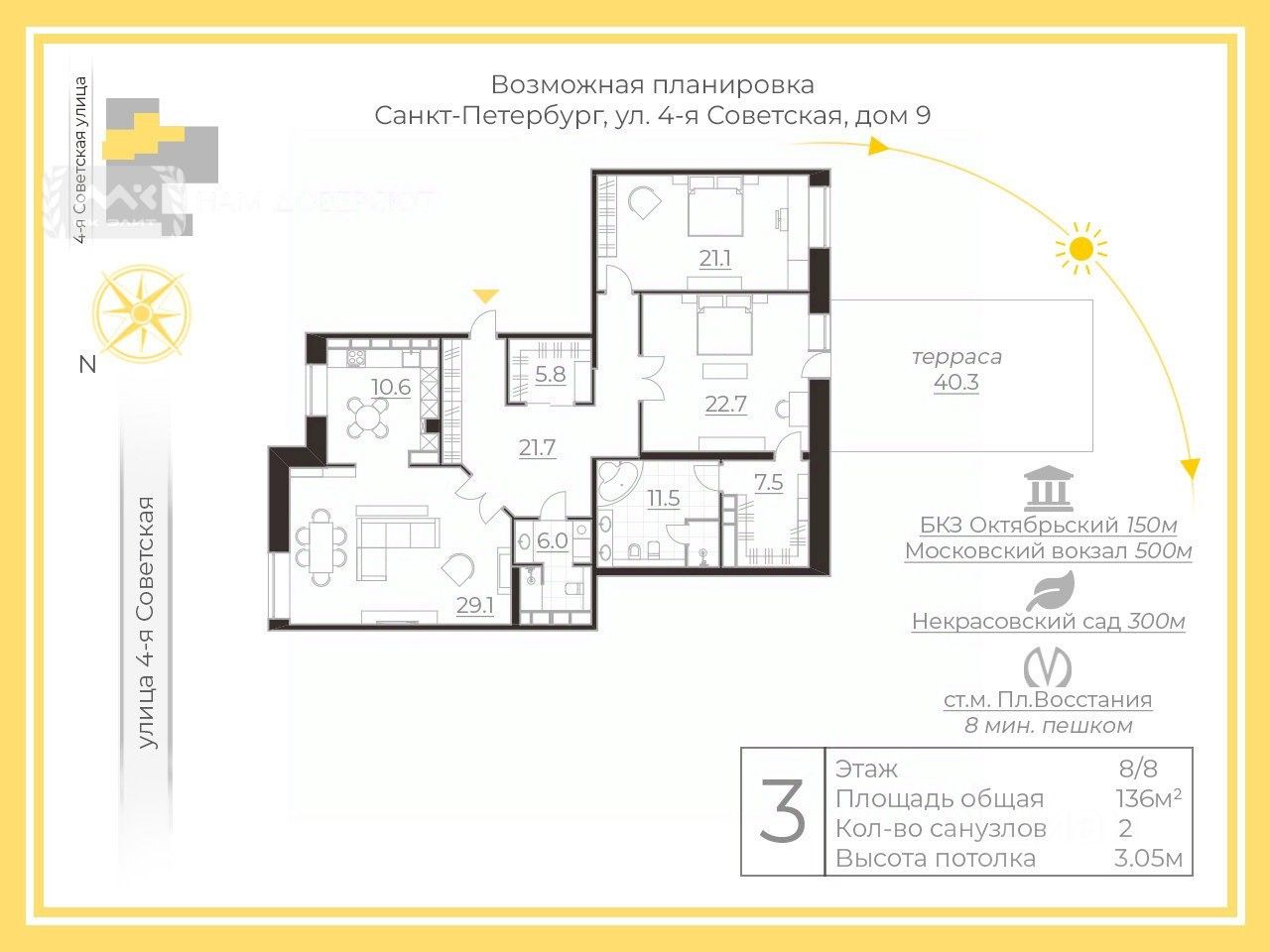 Видовая 4-комнатная квартира с террасой (площадью 40 кв.м.) с которой открывается чудесный вид на панораму города и архитектурные доминанты. Планировка включает в себя 3 спальни, кухню и просторную гостиную, 2 санузла, гардеробную и террасу. Отделка white-box.