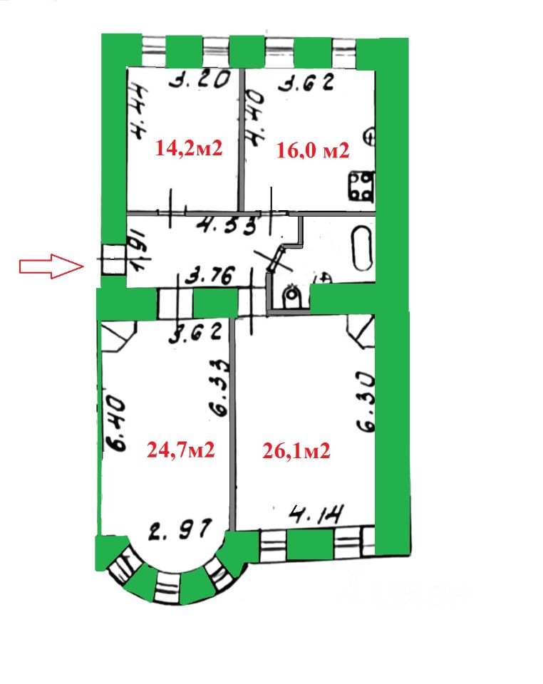 Общая площадь 94,4 м2, кухня 17, комнаты изолированные (26.1+24,7+14.2) правильной формы, в двух из них изразцовые печи, в комнтате 24.7м2 - эркер, ванная 5.0, коридор 8.3.