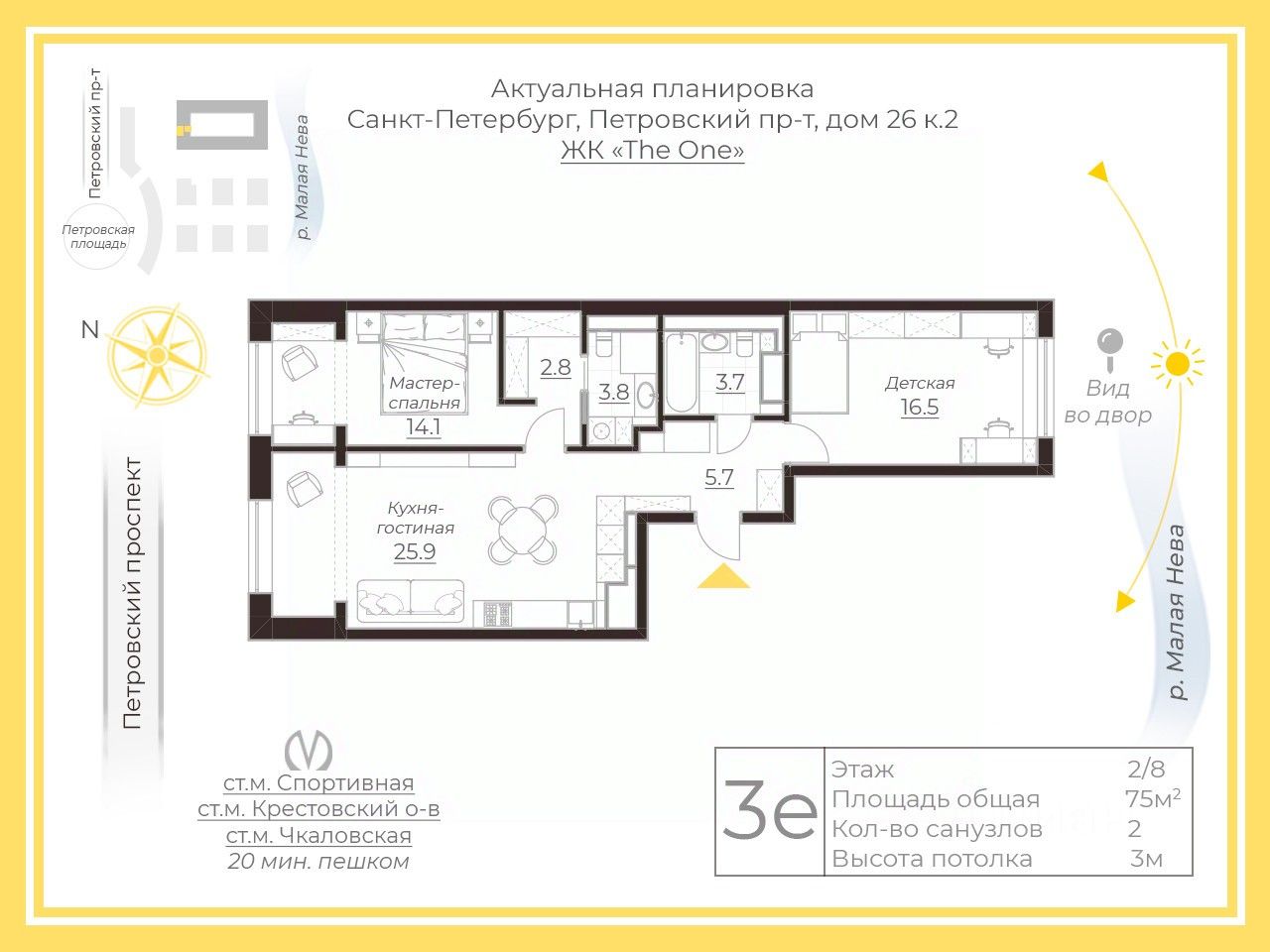 Арт. 125891148 В продаже евро трехкомнатная квартира в престижном жилом комплексе The One на Петровском острове.