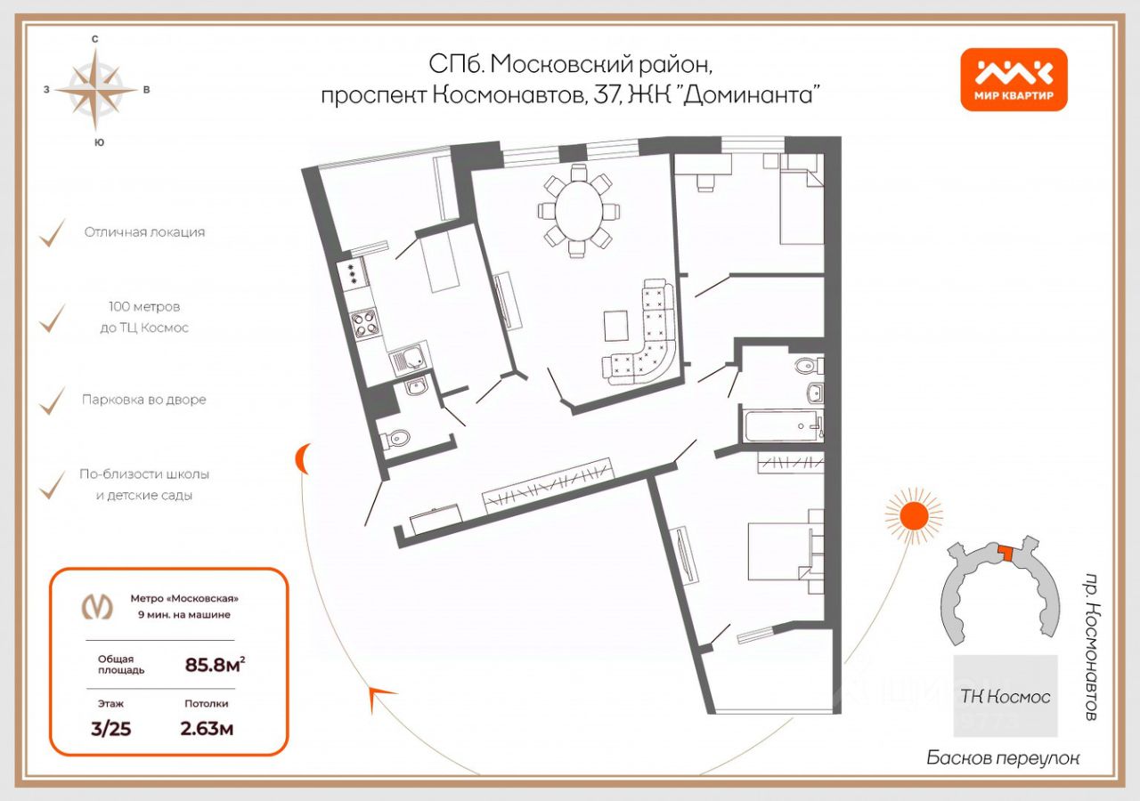 Арт. 126597237 Уважаемый покупатель, Вашему вниманию предлагается великолепная 3-х комнатная квартира в современном жилом комплексе Московского района ''Доминанта'', построенном в 2009 году. Отличное расположение, рядом есть все необходимое для комфортной и счастливой жизни: школы и гимназии, детские сады, магазины и рестораны, банки, торговый комплекс, фитнес-центр, много прогулочных зон, а до Парка Победы и м. Московская всего 5 мин на транспорте. Квартира расположена на 3-м этаже. Общая площадь 85,8 кв.м. Квартира имеет просторную планировку и состоит из 3-х изолированных комнат, кухни с лоджией и двух санузлов. В квартире сделан ремонт, есть теплые полы. Окна выходят в тихий двор. Из парадной выходы на обе стороны дома.