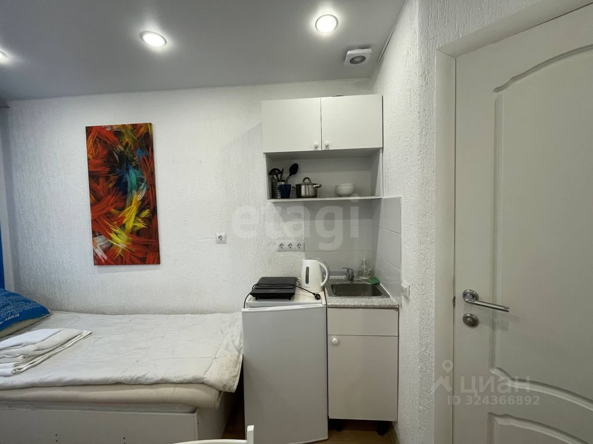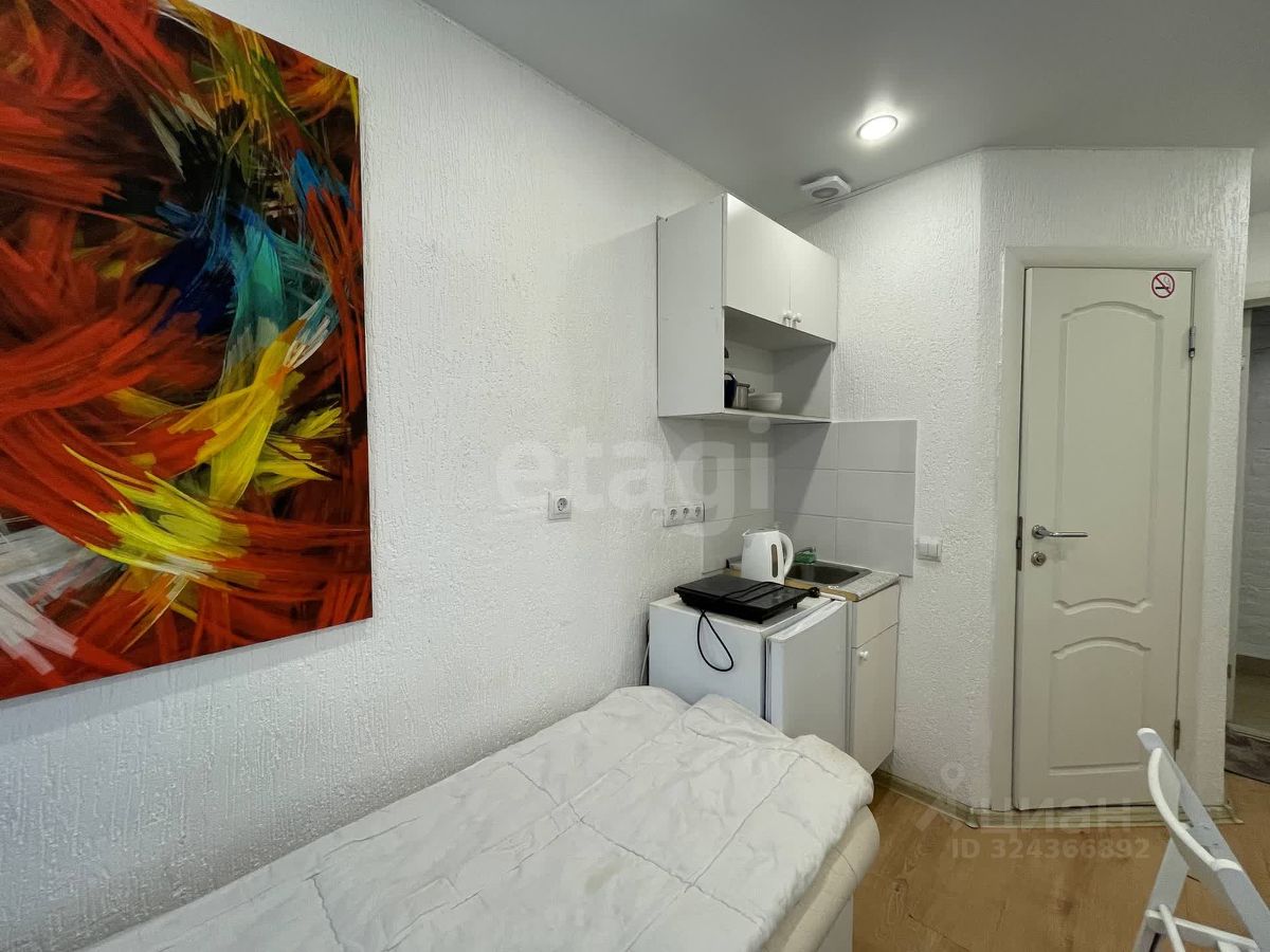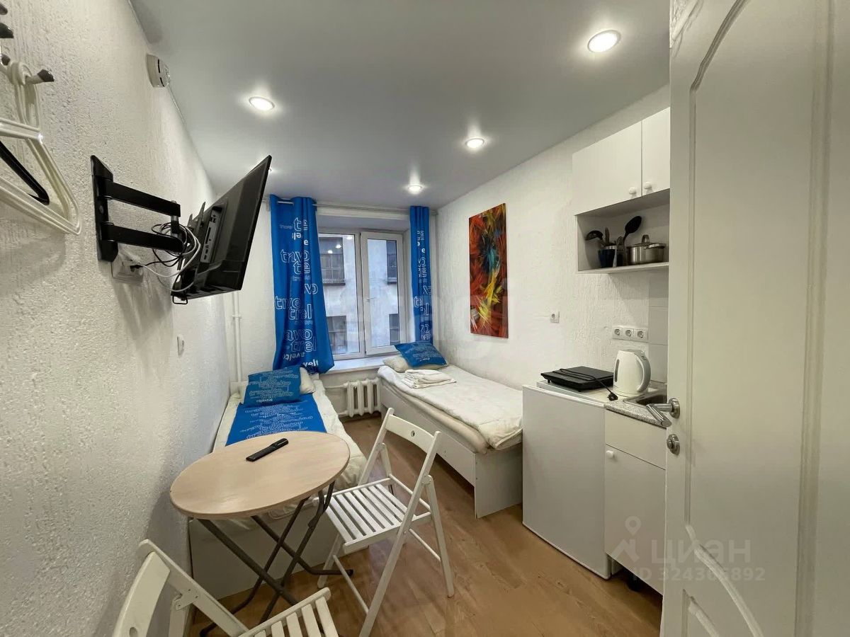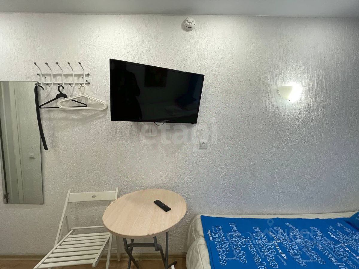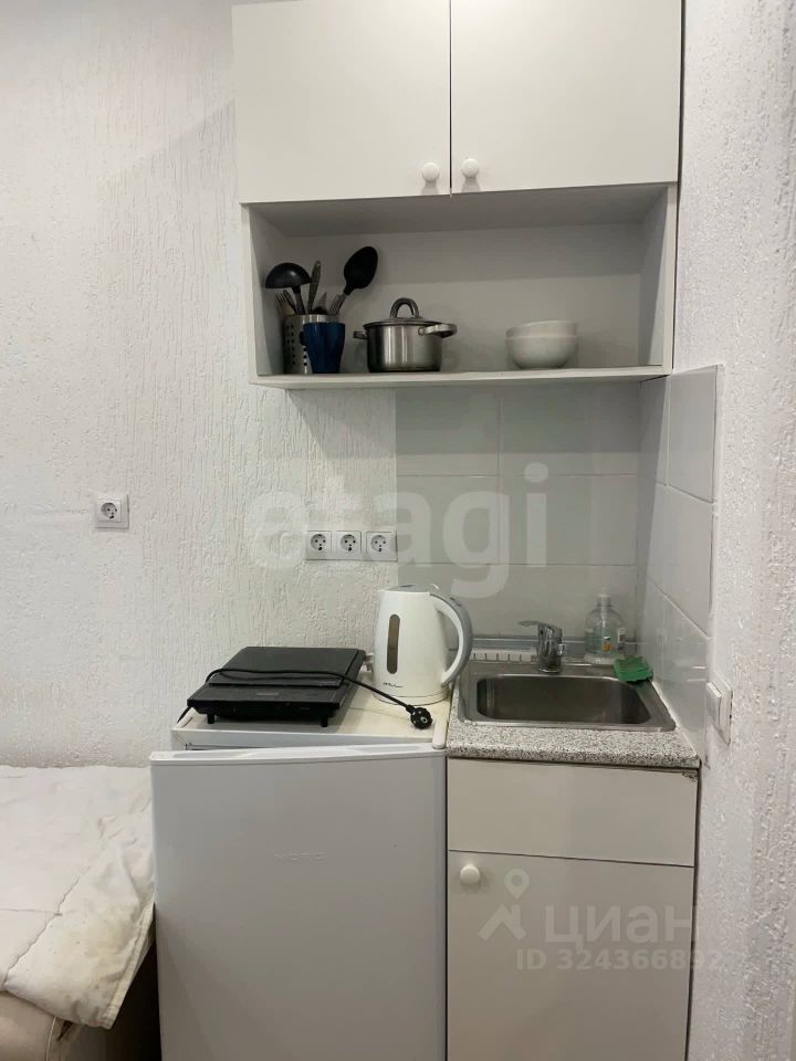 Описание апартамента: — Студия с собственным санузлом и душем. — Установлен бойлер для горячей воды. — Мини-кухня: холодильник, чайник, раковина, шкафы, базовая посуда. — Две кровати, кресло-кровать, телевизор, стол с микроволновкой. — Установлен электронный замок с возможностью удалённой смены кода.