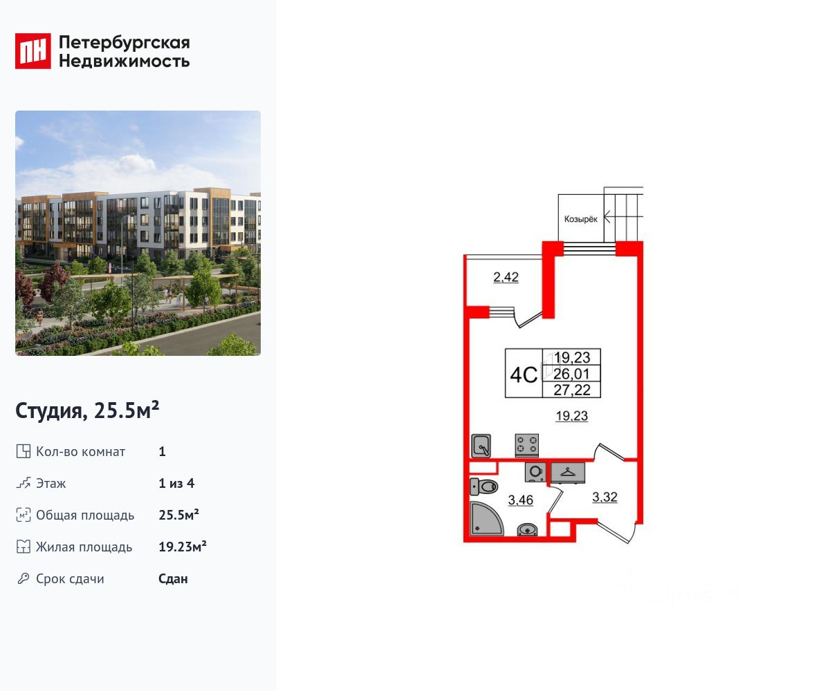 Продается просторная студия в жилом комплексе ''Univer City'' в на юге Санкт-Петербурга. До метро можно добраться на транспорте всего за 30 минут. Удобная, классическая, функциональная европланировка, просторная прихожая 3.32 м². Общая площадь студии - 25.5 м², жилая 19.23 м², высота потолка 2.77 м. Квартира продается с отделкой ''Норд Лайн светлый''. Что особенного в ЖК ''Univer City''? • Малоэтажное строительство • Скандинавские фасады с отделкой керамогранитом, акцентные входные группы • Закрытые внутренние дворы без машин • Пешеходный променад с тематическими зонами, еловый сквер и яблоневый сад • Univer Park, включая SetlSport и SetlKids, площадку для выгула собак и зоны отдыха • Инновационный Лицей Setl с оригинальной архитектурной концепцией и уникальной образовательной средой